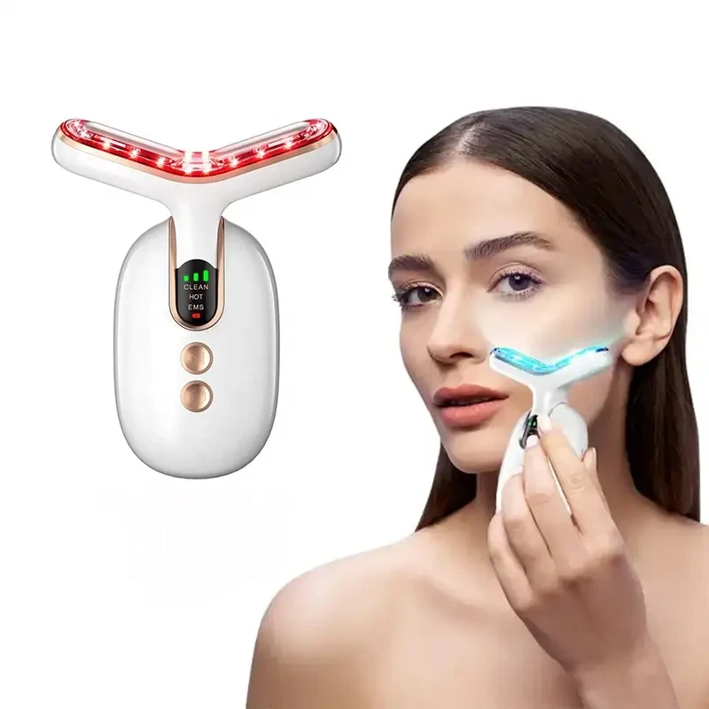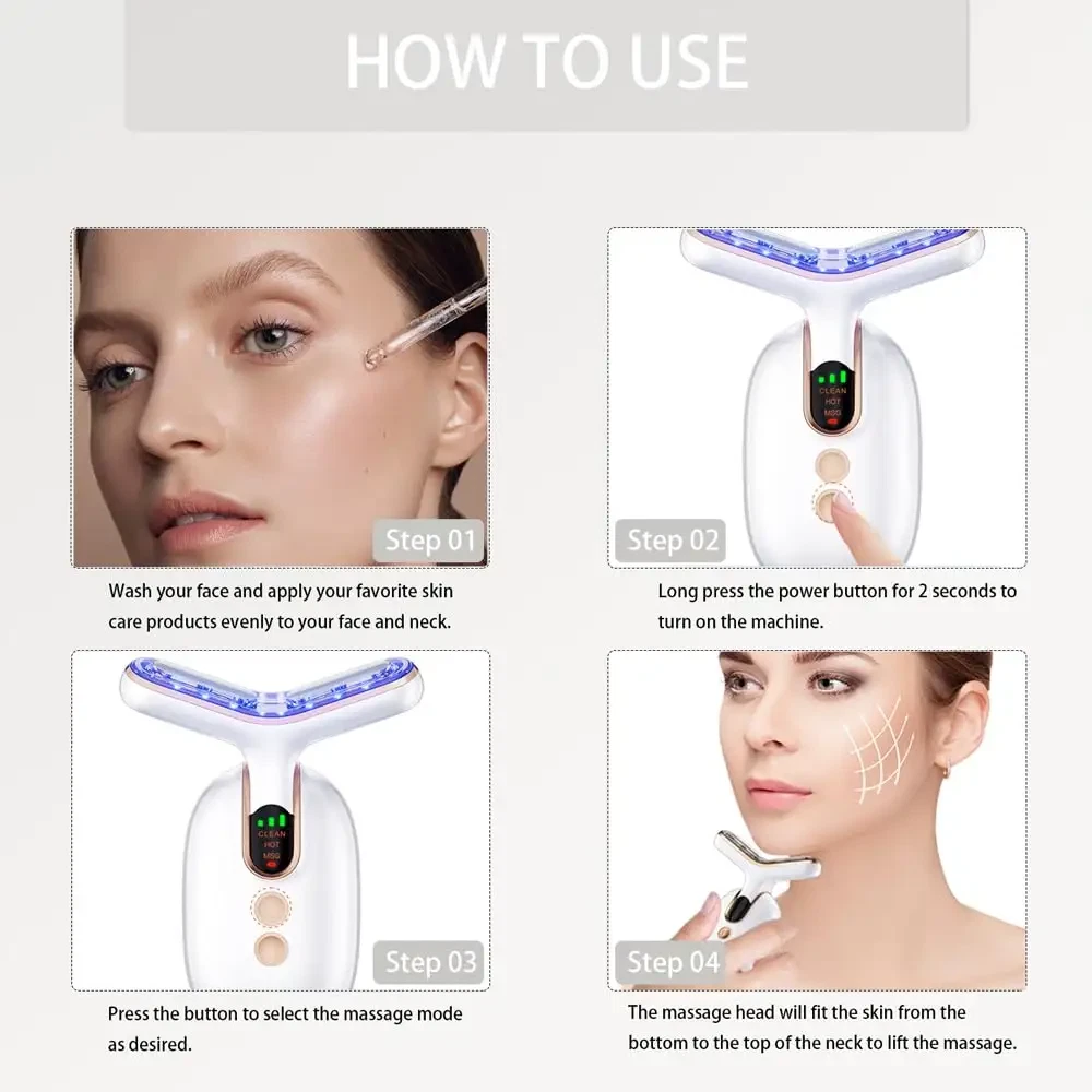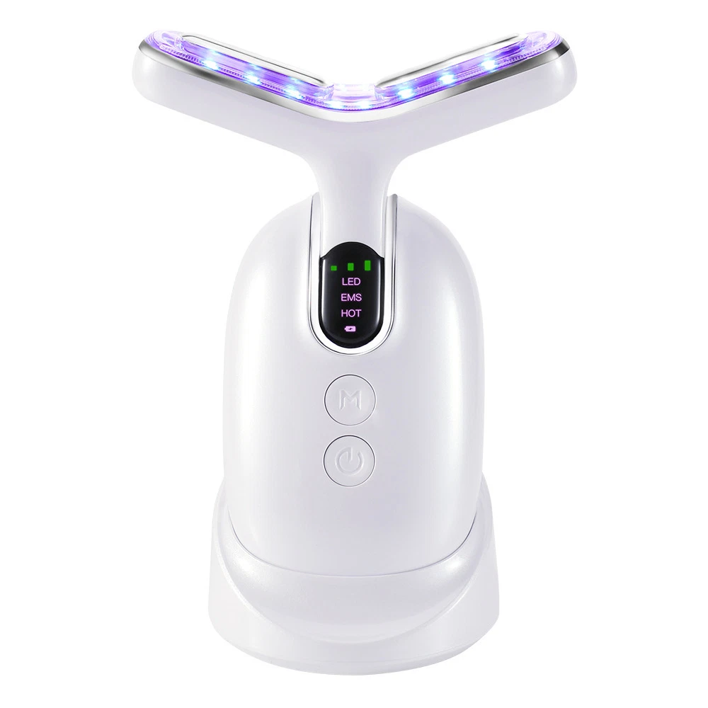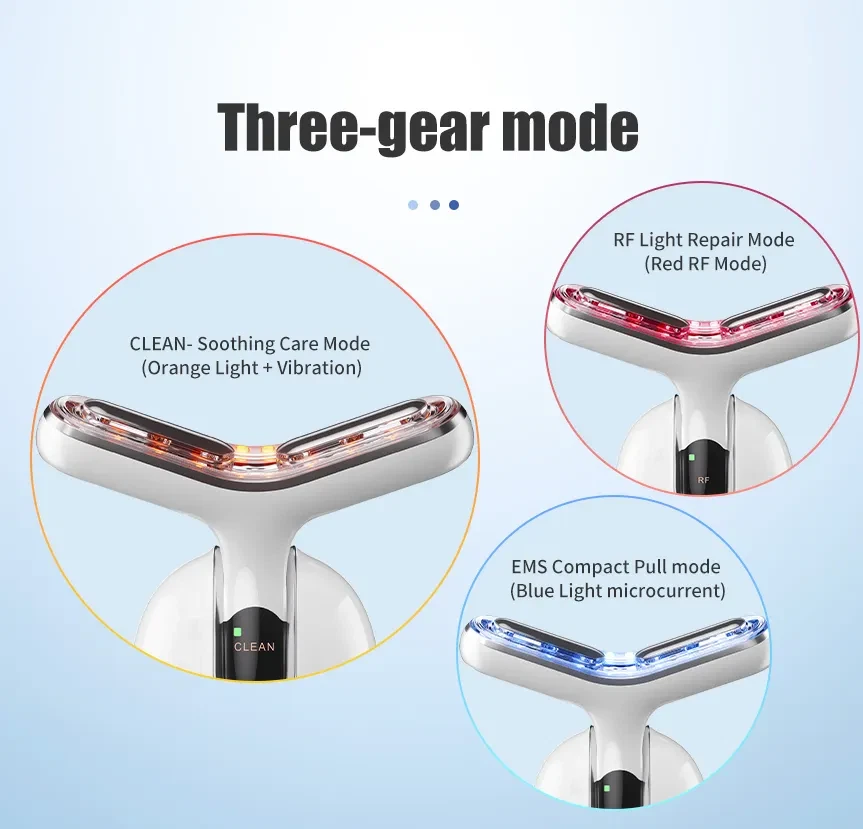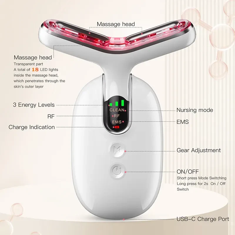 Anti-Aging Face And Neck Lifting Massager Professional RF Neck Face Anti Wrinkle Lift Ems Neck Lift Equipment Massager Features: This product is a color light beauty instrument that can clean skin, EMS care, warm moisturizing, and integrate positive ions + negative ions + high frequency vibration + red light + blue light + green light in the body. -Clean Skin Brightening Mode * Clean the garbage deep in the pores to achieve the effect of shrinking pores, light spots and acne, and solve the dull and dull skin. -EMS nursing Mode * Fully introduce skin care products to enhance skin activity and achieve the effect of whitening and rejuvenating skin and wrinkles. -Warm moisturizing mode * Warm massage promotes skin circulation, improves skin firmness and elasticity, keeps skin in the best condition for a long time, and restores skin's radiance and vitality. Specification: Produt name: EMS RF Neck Face Massager Beauty Device Model number: JY-810 Material: ABS Colors: Black or White-gold or White-silver Power supply: Built-in 3.7V 900mAh rechargeable battery Charging time: About 2 hours Rated power: 6W Input voltage: 5V1A Auto power off: After 3 minutes if no operation 3 working modes: CLEAN. RF. EMS "CLEAN" mode: Smoothing care mode. Orange light+viberation "RF" mode: Light line repair mode. Red light+RF mode "EMS" mode: Tighten pull mode. Blue light+microcurrent 3 strengthen levels: High. Medium. Low LED light: Built-in 18pcs LED light Packing list: 1 x EMS RF Neck Face Massager 1 x Base 1 x USB Cable 1 x Cloth 1 x Bag 1 x User Manual