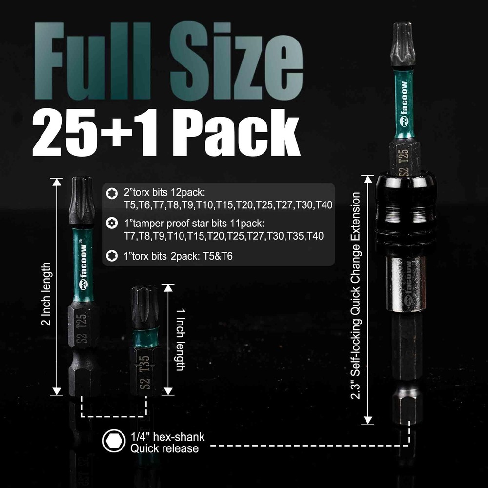 Facoow Torx Bit Set(T5-T40), 26 Pack Security Torx Bits Set with Magnetic Tips,Tamper Proof Star Bits Set S2 Alloy Steel, 1"&2" Long Impact Torque Bit Set & 2.3" Self-locking Quick Change Extension Full Size Set(25+1): Old customers recommend. 2”torx bits 12pack(T5,T6,T7,T8,T9,T10,T15,T20,T25,T27,T30,T40); 1”tamper proof star bits 11pack(T7,T8,T9,T10,T15,T20,T25,T27,T30,T35,T40)+T5&T6 are not tamper proof bits; 2.3" Self-locking quick change hex shank extension. S2 alloy steel(impact grade): Heat and harden treated and the surface is phosphated black - The torx bit can stand up well to abuse under impact driver under great pressure and high torque. Strong magnetic torx bit tips + Self-locking quick change hex shank extension: More handy to pick up screws in long, narrow and complex spaces. Precise fit on screw head: CNC machined tips(true-to-size and well-formed) ensure accurate and precise fitment, which is essential for optimal performance. Well-put-together torx bit set: Good for household projects, consumer electronics etc.For example Playstation, vacuum, laptops, security gate, rifle scope, bike etc. Shipping We offer FREE shipping on all orders! We ship within Three business days of payment, usually sooner. We use a selection of shipping services such as UPS, FedEx, USPS etc. We only ship to the lower 48 states, no APO/FPO addresses or PO Boxes allowed. Local pickups and combined shipping options are not provided at this time. Return You can return a product for up to 30 days from the date you purchased it. Any product you return must be in the same condition you received it and in the original packaging. Please keep the receipt. Payment We accept payment by any of the following methods: PayPal Please pay as soon as possible after winning an auction, as that will allow us to post your item to you sooner! Feedback Customer satisfaction is very important to us. If you have any problem with your order, please contact us and we will do our best to make you satisfied. Contact Us If you have any queries, please contact us via ebay. We usually respond within 24 hours on weekdays. Please visit our eBay store to check out other items for sale! Thank you for shopping at our store.