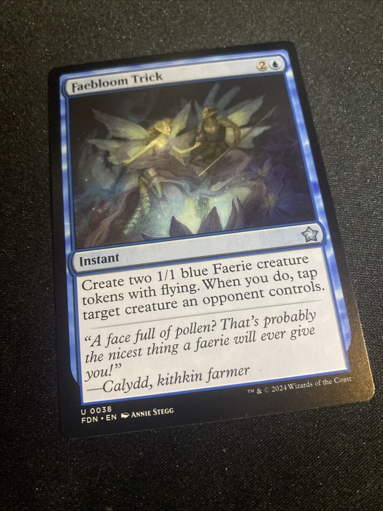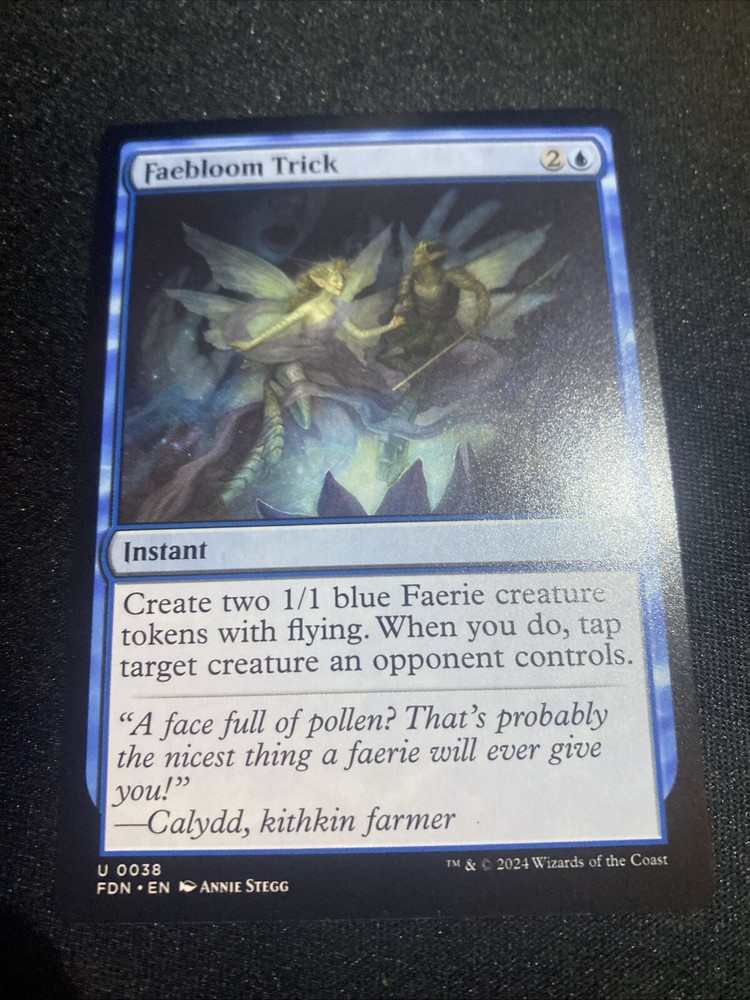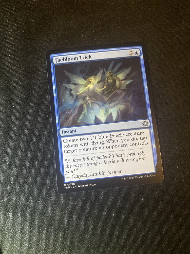 Rarity:UncommonAdditional Description:Faebloom TrickIllustrator:Annie SteggGame:Magic: The GatheringLanguage:EnglishCard Text:Create two 1/1 blue Faerie creature tokens with flying. When you do, tap target creature an opponent controls.Manufacturer:Wizards of the CoastCard Type:InstantCard Number:38Attribute/MTG:Color:BlueCost:2uSet:FoundationsFinish:Regularbrand:Wizards of the CoastCard Name:Faebloom Trick
