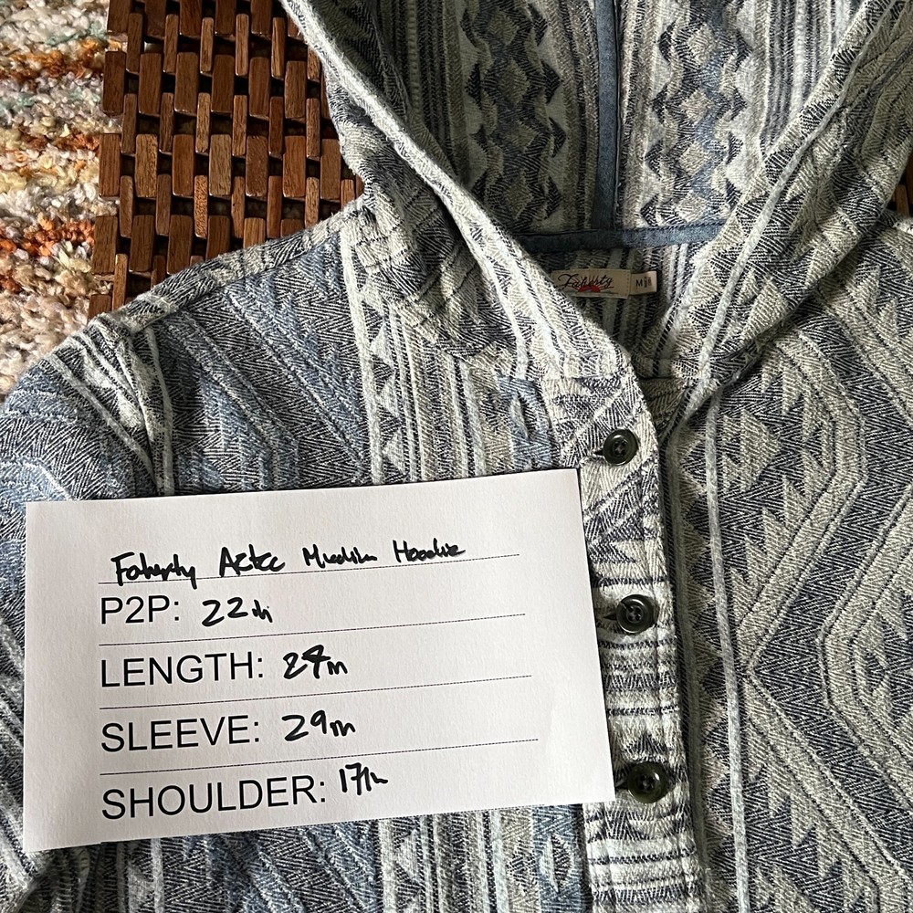 The Faherty Brand Aztec Print Henley Hoodie in Grey Blue is a stylish and comfortable men's size medium hoodie. Made of cotton knit fabric, this hoodie features long sleeves, a drawstring closure, and a hooded design. The Aztec print adds a unique touch to the pullover style, making it a great choice for the winter, fall, and spring seasons. Perfect for casual wear and walking activities, this hoodie by Faherty is a versatile addition to any man's wardrobe.