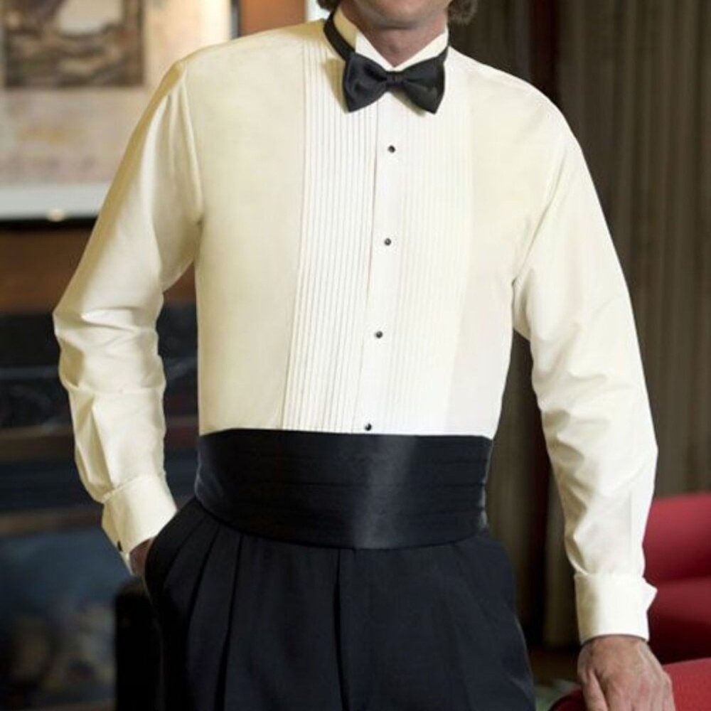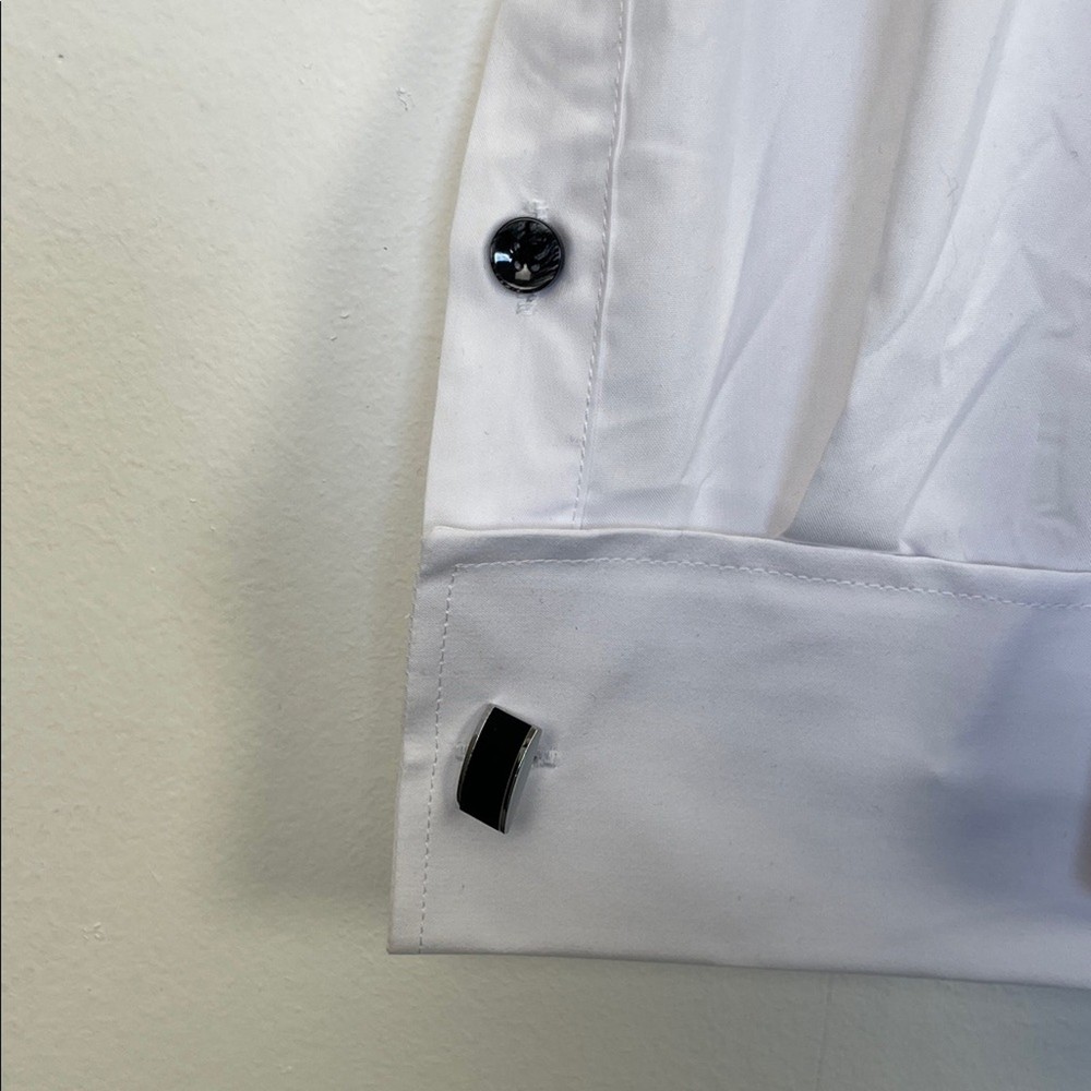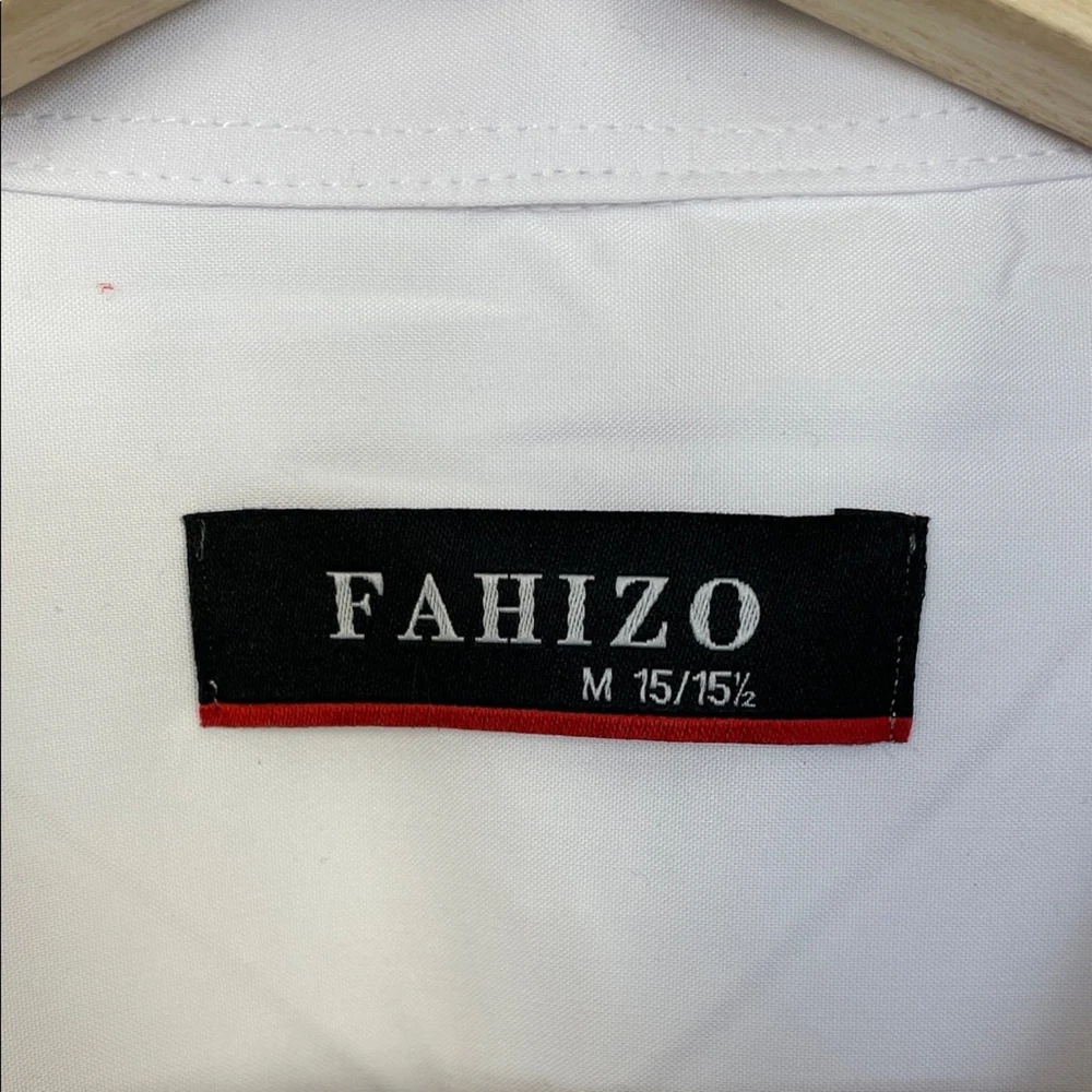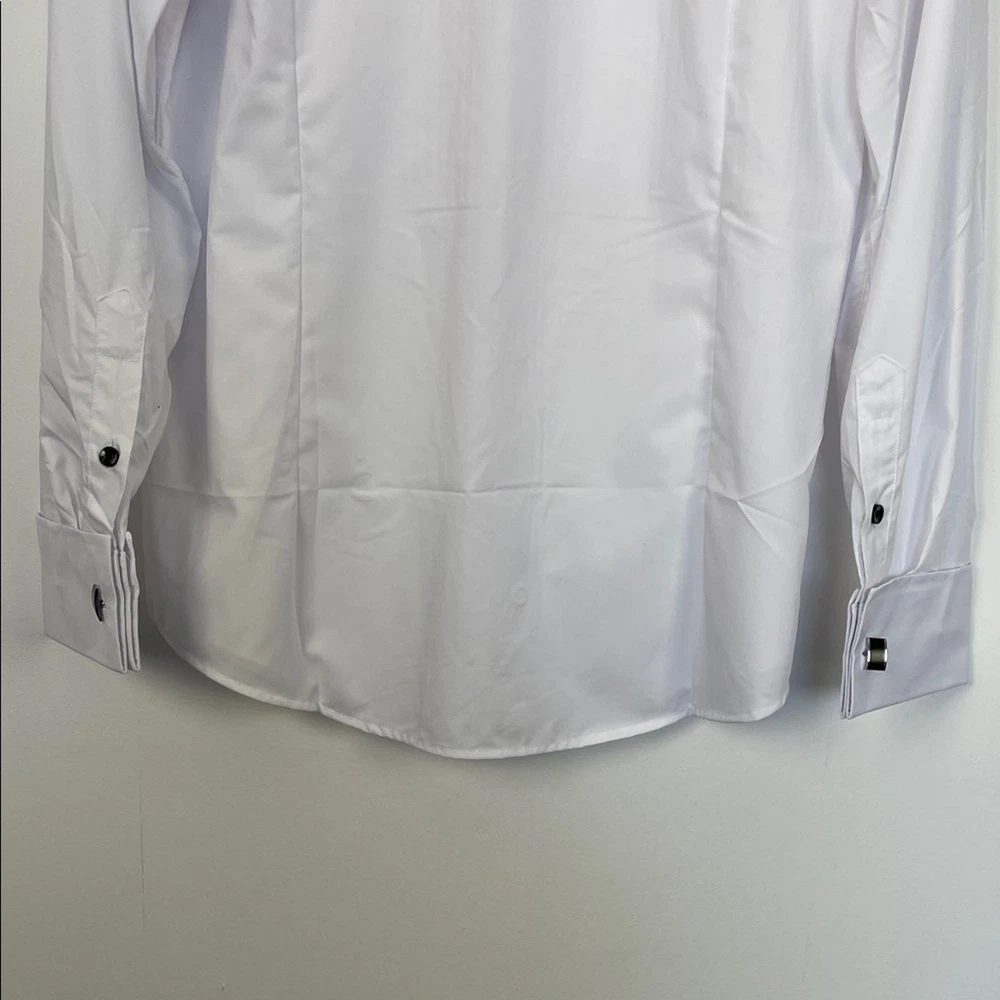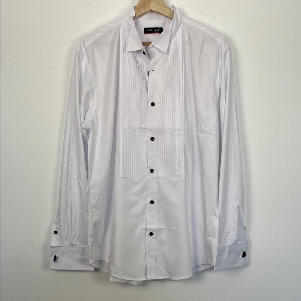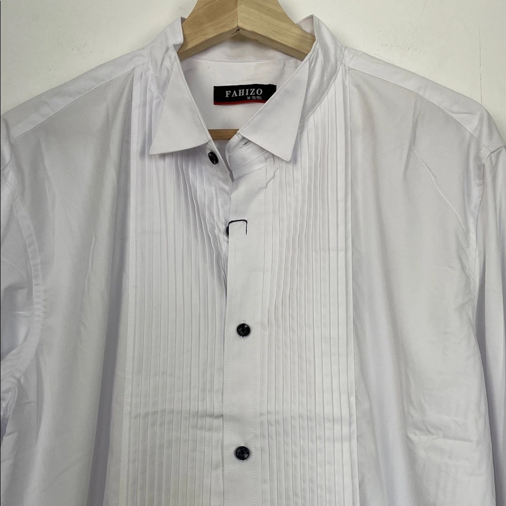 Fahizo Wing Collar Tuxedo French Sleeve Cutt Men's Classic White Dress Shirt. FEATURES: Flaws: None visible, pre-loved Good Condition, See Measurements Below Style Profile: Elevate your wardrobe with this pleated front classic white dress shirt with a lapel pin . Perfect for any formal occasion. Approximate measurement Chest (pit-to-pit, laid flat): Small (19") Medium (21") Length: Small (28") Medium (29") 64-7-0042001302026