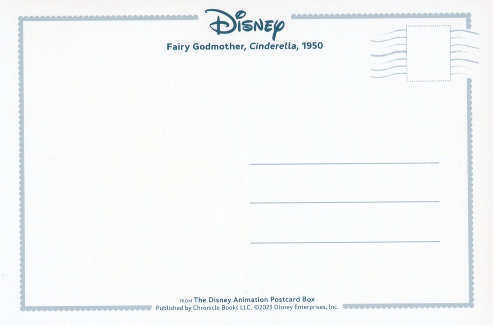 Fairy Godmother from the Movie Cinderella , 1950, Film Frame --New POSTCARD Unused postcard in Excellent Condition 5.5" x 3.75" Disney Collection 2023 Excellent Condition: Like mint in appearance with no bends or creases, or rounded or blunt corners. May be postally used or unused and may have writing and postmark only on the address side. A clean, fresh card on the picture side. Very Good Condition: Corners may be just a bit blunt or rounded. Almost undetectable crease or ben that does not detract from overall appearance of the picture side. May have writing or postal use on address side. A very collectible card.