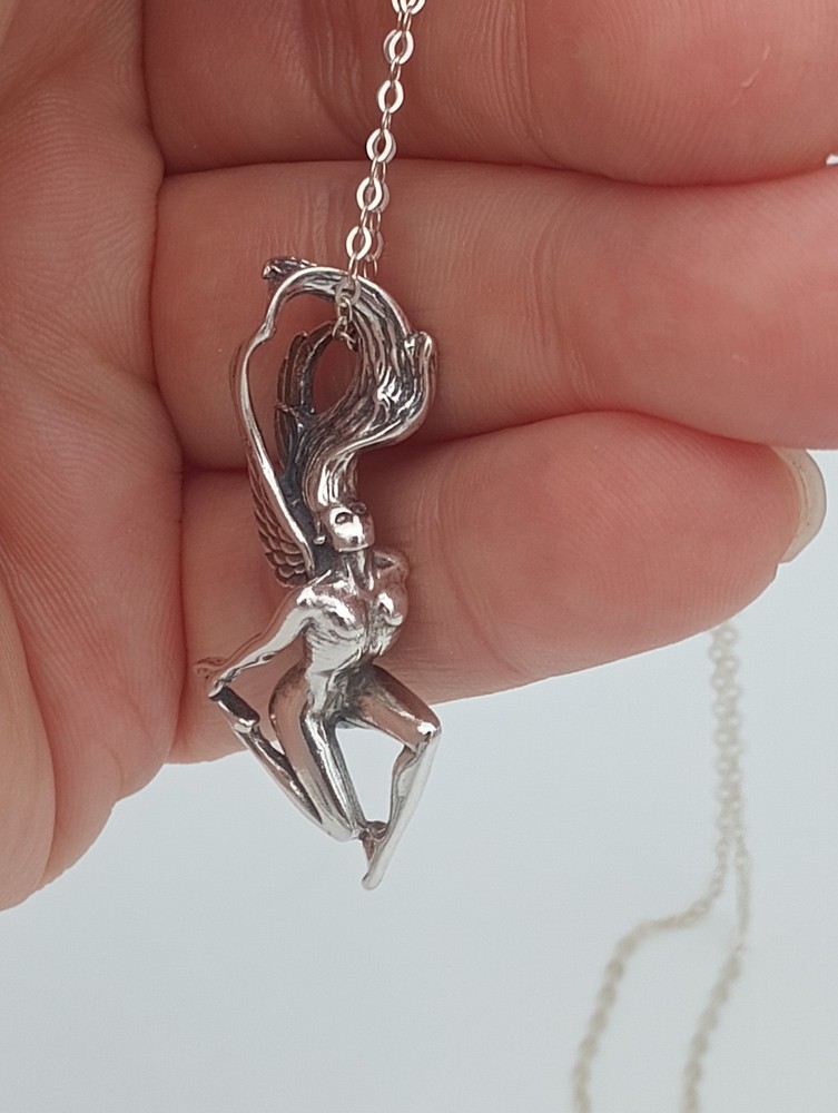 The fairy necklace features a nude fairy pendant made of sterling silver, with a metal purity of 925. The elegant design of the pendant showcases intricate details of a fairy, making it a unique and whimsical accessory. Perfect for those who appreciate fantasy and mythology in their jewelry choices, this necklace adds a touch of magic and charm to any outfit. Hello; you can request a 16" or 18" chain. Pendant is made in USA/chain is made in Italy You will receive what is shown in the photos.