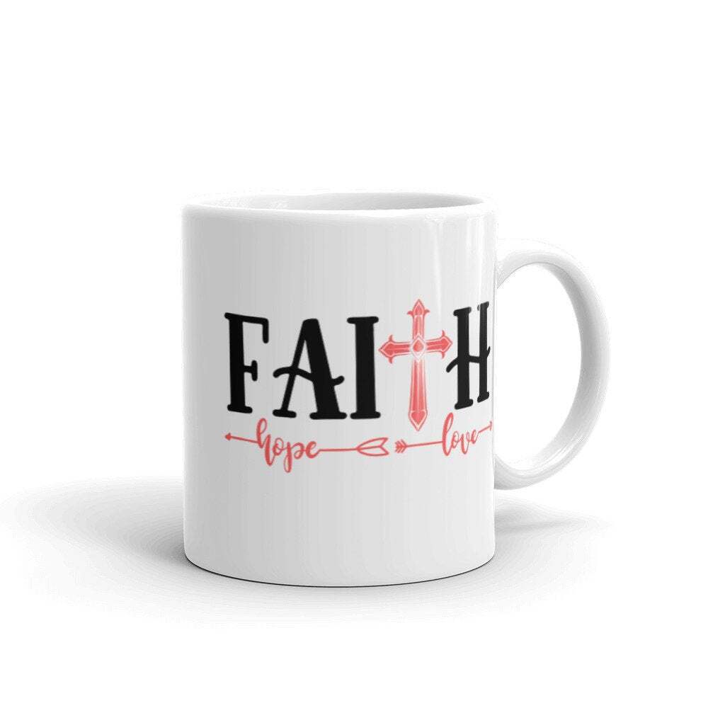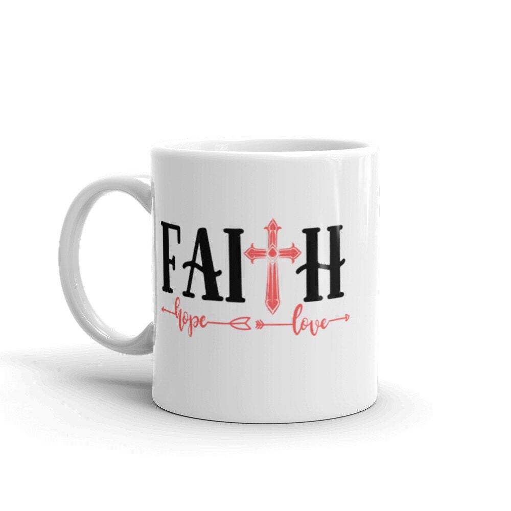Faith Hope Love Christian Mug Religious Mug Jesus Inspirational Mug White Mug Product Details.. This high quality 11oz. ceramic white mug has a premium hard coat that provides crisp and vibrant color reproduction sure to last for years. Perfect for all hot & cold beverages. The highest quality printing possible is used. It will never fade no matter how many times you wash it. Material: 100% Ceramic. Print both sides. Dishwasher and Microwave Safe. High Gloss + Premium White Finish. Printed in the U.S.A. Personalized & Custom. We support personalized and custom mug to add custom, when placing an order, you can add notes to the "order note" in shipping address section. Also you can contact us directly via message. Shipping Info. Ready to ship in 1 to 2 business days, All products are made-to-order and proudly printed in the United States. Shipped by USPS and DHL, You will receive your order in 5-7 days. Replace & Refund. All products are defective during shipping broken, chipped will be replaced free of charge. You are not satisfied with the product, we will refund 100% money to you. If any other issues arise, please do not hesitate to message, we would be more than happy to assist you.