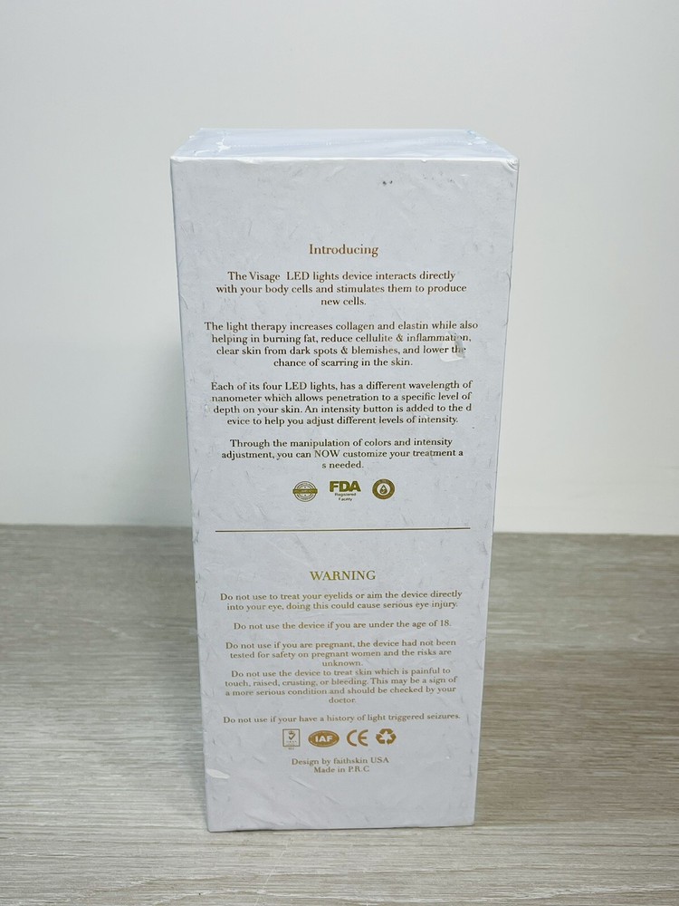 BRAND NEW SEALED. FAITH Skin Care Labs has a product to help you regain the natural and rejuvenated glow you deserve! Designed using NASA proven technology, VISAGE is a one-of-a-kind skincare device that utilizes a single LED light. By combining Red and Blue LED light waves to create a unique Purple LED light therapy, your VISAGE device will help eliminate toxins, reduce inflammation, and improve the healing and circulation of blood in the facial area. Your VISAGE device is uniquely built to support a 24k gold head to release the perfect temperatures--providing topical heating and increasing blood flow within the device’s three modes. Before using VISAGE, make sure your device is fully charged. As soon as you are ready to start using your device, cleanse your face with an oil-free cleanser to remove any make-up or oil. After cleansing, apply the FAITH activated serum to the areas you want to be treated--such as the forehead, cheeks, eyes, and neck areas and turn on your VISAGE device. Starting with the HOT Compress Mode, apply light pressure to the areas being treated while slowly moving the device in a small, circular motion. Treat each area for three minutes. This will open pores, burn fat, strengthen collagen, and eliminate any fine lines or wrinkles in the skin. Turn to Sonic Vibration Mode to allow the product to absorb evenly and deeply into the core of the skin--treating the problem at its source. This mode also helps relieve signs of fatigue, while rejuvenating the facial complexion. Finish on to the Cold Compress Mode to help close pores and seal in moisture after treatment. Notice the enhanced elasticity and your skin’s natural glow! To achieve optimal results, use your VISAGE Skin Care device three times a week for the first month. After one month, simply use your device once a month or as needed. Your VISAGE box includes: Base Stand USB Charger Instruction Manual VISAGE is non-invasive and clinically proven to be 100% safe to use. It is dermatologist recommended and cleared as a medical device by the FDA.