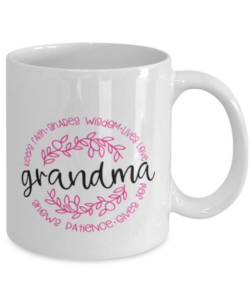Grandma Coffee Mug Keeps Faith Shares Wisdom Lives Loves Shows Patience Gives Product Details.. This high quality 11oz. ceramic white mug has a premium hard coat that provides crisp and vibrant color reproduction sure to last for years. Perfect for all hot & cold beverages. The highest quality printing possible is used. It will never fade no matter how many times you wash it. Material: 100% Ceramic. Print both sides. Dishwasher and Microwave Safe. High Gloss + Premium White Finish. Printed in the U.S.A. Personalized & Custom. We support personalized and custom mug to add custom, when placing an order, you can add notes to the "order note" in shipping address section. Also you can contact us directly via message. Shipping Info. Ready to ship in 1 to 2 business days, All products are made-to-order and proudly printed in the United States. Shipped by USPS and DHL, You will receive your order in 5-7 days. Replace & Refund. All products are defective during shipping broken, chipped will be replaced free of charge. You are not satisfied with the product, we will refund 100% money to you. If any other issues arise, please do not hesitate to message, we would be more than happy to assist you.