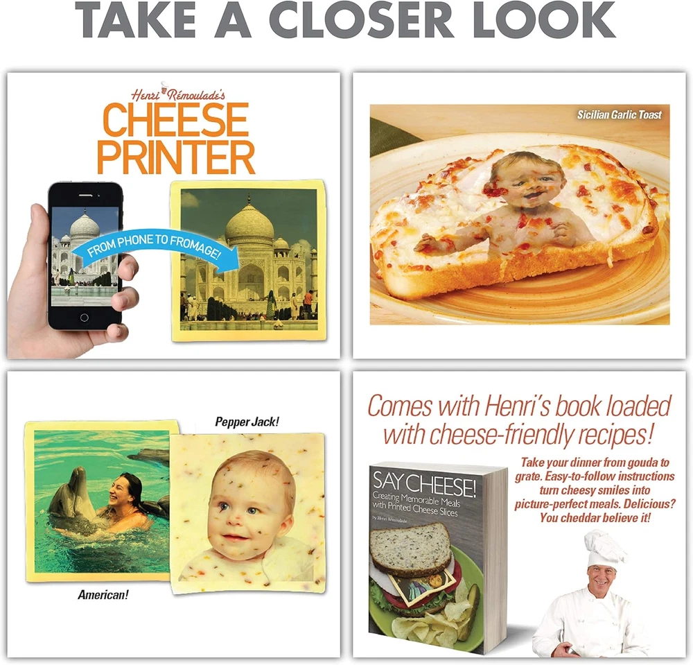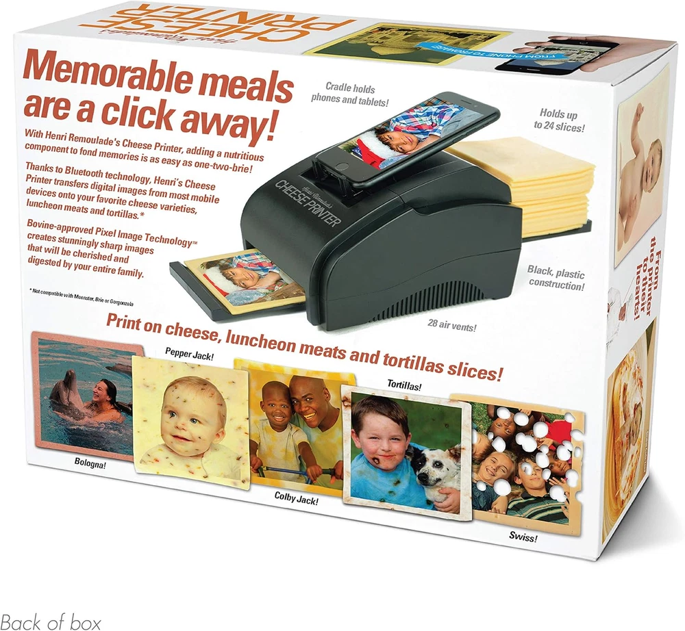 Prank-O Cheese Printer Gag Gift Empty Box, Birthday Gift Box, Wrap Your Real Present in a Convincing and Funny Fake Gift Box, Practical Joke for Birthday Presents, Holidays, Parties PRANK GIFT BOXES at first appear to contain bizarre products from ridiculous companies. Simply, “Put Your Real Present Inside the Joke Box" and try to keep a straight face as you watch your friends & loved ones attempt to remain gracious while thanking you for the present. Then watch them explode with laughter when they discover their actual stuff inside and realize they’ve been pranked. (DOES NOT INCLUDE ACTUAL CHEESE PRINTER) TAKE YOUR GIFT GIVING TO THE NEXT LEVEL WITH THE ORIGINAL GAG GIFT BOX. We pride ourselves on our incredible attention to detail. We’ve thought of everything from the ridiculous fictional product itself, to the hilarious images and detailed product description. This box will have any recipient truly convinced that you just gave them the most bizarre gift of all time... but it's just a fake present box ADD THE GIFT OF LAUGHTER to the party with this quirky and fun twist on the timeless tradition of fun gag gift giving for boyfriend, girlfriend, mom, dad or kids. Whether you consider your funny gift giving skills to be amazing or not, wrapping any gift inside a Prank Pack adds an extra layer of fun and enjoyment that will have everyone in the room laughing HIGH QUALITY GIFT PRANK BOXES made in the USA of 100% recyclable cardboard. Our boxes ship flat and are easy to assemble – no glue or extra steps required. At 11.25” x 9” x 3.25” they are the perfect size for almost all funny gag gifts! Made in the U.S.A. PLEASE NOTE. This is an EMPTY prank GIFT BOX - QUARANTINE FUN Product Description Become the life of the party by disguising your present inside one of our gift boxes! Shop witty options for baby showers, birthdays, Christmas, or any other special occasion to bring a whole new level of fun to the gift-giving experience. They’re the boxes for screamingly funny, hilariously awful, but scarily plausible products that don’t really exist. The photography, typography and layout of these boxes are perfect. I mean, they look exactly like the cheesiest products you’d buy from TV infomercials. Anyway, the point is that you put people’s real presents inside the Empty Prank Pack boxes . Then, when they unwrap their gifts, you get that delicious moment of watching their faces as they struggle to be tactful. They think you’ve just given them the all-time turkey of presents. Once they figure out that it’s just a satirical prank, there’s even more laughter — and then gratitude for the much more thoughtful present you’ve stashed inside. Bring the humor to every party with our one of a kind prank gift boxes. They are more than just an empty box, but a moment to experience fun and laughter with the entire family. SIZE OF BOX Each Prank Pack gift box measures: 11.25”x 9”x 3.25”. (About the size of a giant phone book.) Fit any standard size present in our hilarious, witty, empty boxes. Easy to assemble, lightweight, realistic experience for the entire family or friend group. HOW IT WORKS Stash the real presents inside the empty Prank Pack boxes. Then, when they unwrap their gifts, you get that delicious moment of watching their faces as they struggle to be tactful. They might think they're really opening a junk drawer kit, or a snack hat, when in reality, their nice gift is inside. PRANKED Once the victim opens the box they will see two bright yellow tabs that read, “Prank You!” & “ Don’t get too excited, your real gift is inside.” Enjoy pranking your friends, while also gifting them a real, nice gift too! Create an experience for the whole family with a fun, goofy surprise. OUR MISSION: CONFUSE & AMUSE At Prank-O we are dedicated to bringing a little deception and a lot of laughs to the gift-giving experience. After all, there is no greater gift than laughter… except for one of those remote-control quadcopter things.