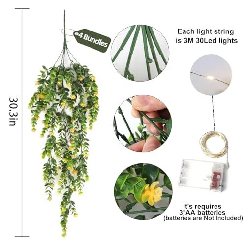 Return Policy Fast Delivery Trusted seller Fake Eucalyptus Leaves with Flowers Plastic Ivy Greenery Leaf with Lights Artificial Hanging Plants for Home Garden Wall Bedroom Office Wedding Decor 4Pcs Yellow Product Description Fake Hanging Plants Packaging: Each package contains 4Pcs of artificial hanging eucalyptus greenery with flowers and led lights, each of which measures about 29.9’’ long. This lush realistic faux plants will surely add a natural atmosp to your life Durable Materials: Made of high quality plastic, our fake ivy vine plant is durable and waterproof. As a result, you can enjoy the eternal vitality and beauty the hanging leaves bring without constantly replacing them Lifelike Appearance: Compared with real plants, our hanging fake plants will not wilt and fade, so they can always remain vibrant and alive with you. The faux fern stems can also be put along with real plants to create a unique flower arrangement Exquisite Decorations: The faux hanging flower vines can be placed indoors and outdoors, like home, office, bedroom, patio, front porch, backyard, front yard, garden, balcony, windowsill, veranda, etc Easy to Care: The artificial vines will neither die nor fade, and don’t require trim, sunlight and water, so these plastic plants are suitable for people who have a busy schedule but want to enjoy nature Shipping Returns Payment Shipping Shipping is FREE to all addresses other than APO/PO boxes in the lower 48 states. All our stock ships from US-based warehouses. Shipped via USPS or UPS (depending on location and package weight) Unless stated otherwise, all orders will ship within 24-72 hours of your payment being processed. Check our feedback to see the great reviews of FAST shipping we offer. Returns Seller does not accept returns Payment We currently accept payment via eBay managed payments only. Once payment is cleared, we will dispatch your shipment within 1-3 business days. Please refer to the "Shipping" tab for more information regarding shipping speed to your destination.
