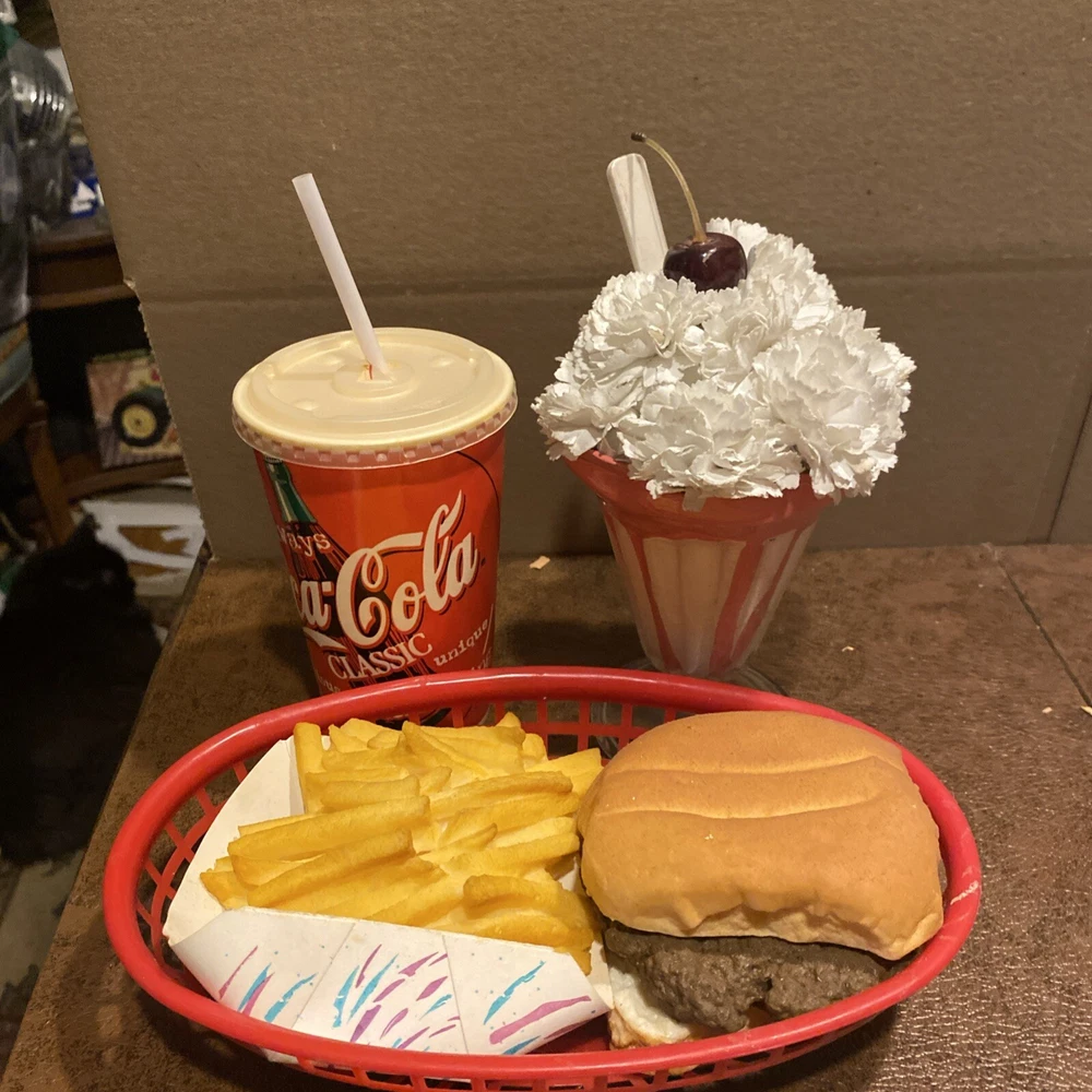 This fake food prop display features a delicious hamburger with French fries and a red basket for easy viewing. It is perfect for restaurants and food service businesses looking to enhance their décor. The display is made by Halco and is a great addition to any collection. The product is a sandwich and the country/region of manufacture is unknown. This item is ideal for those interested in display food and wants to add a unique touch to their collection. see photos/ coke cup is empty