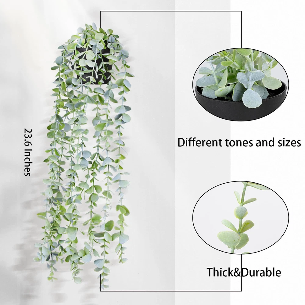 【Realistic Design】Displaying trailing eucalyptus in black pot hanging decor, realistic & lifelike design, mini sized and space saved. 【High Quality】Artificial leaves are made with high quality and safe durable plastic material. The leaves have different tones and sizes making it look very realistic. 【Decent Size】The whole hangings vine approx 23.6Inches/60CM long (but you could vary it shorter or longer), comes with 9x artificial plastic eucalyptus vine leaves trails. The size of the flower pot is 6.5*8CM.The weight of each plant with pot is 300g. 【More Uses】You can hang on the wall, shelf, coffee table, dresser, or nightstandand anywhere as you like to enjoy with our faux hanging potted plants. 【】If you have any question during the use, please do not hesitate to contact us, we will help you solve the problem with 100% satisfaction.