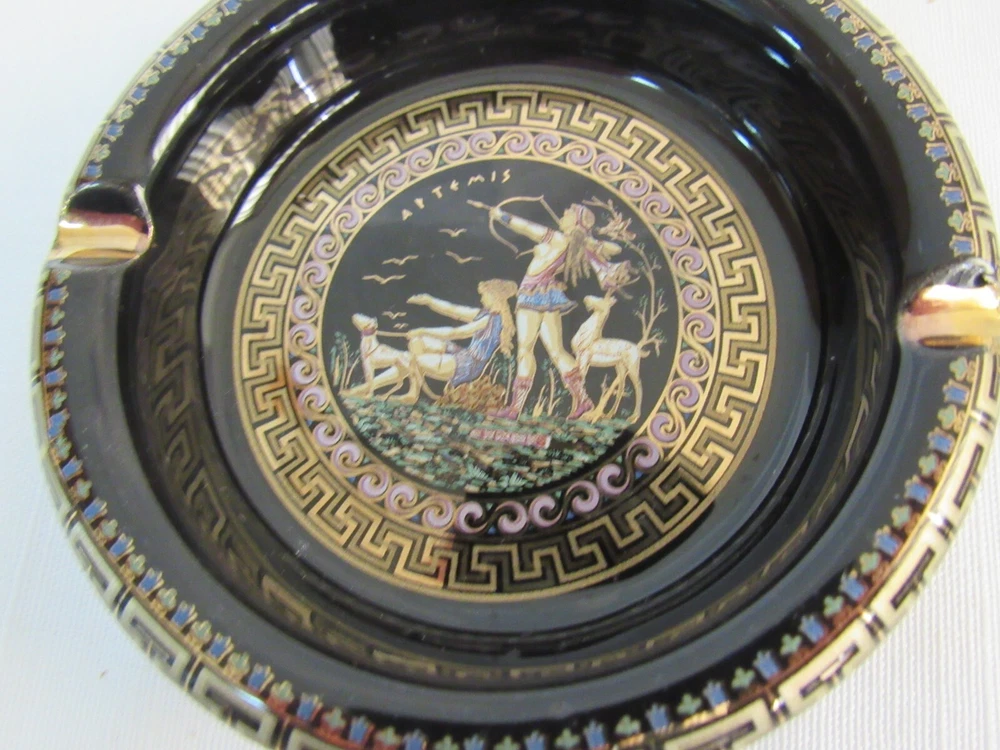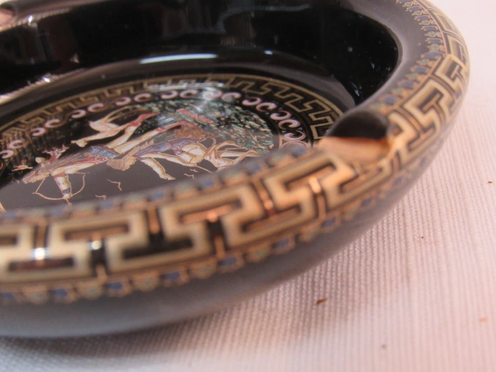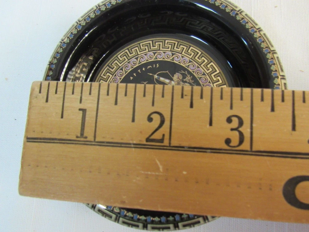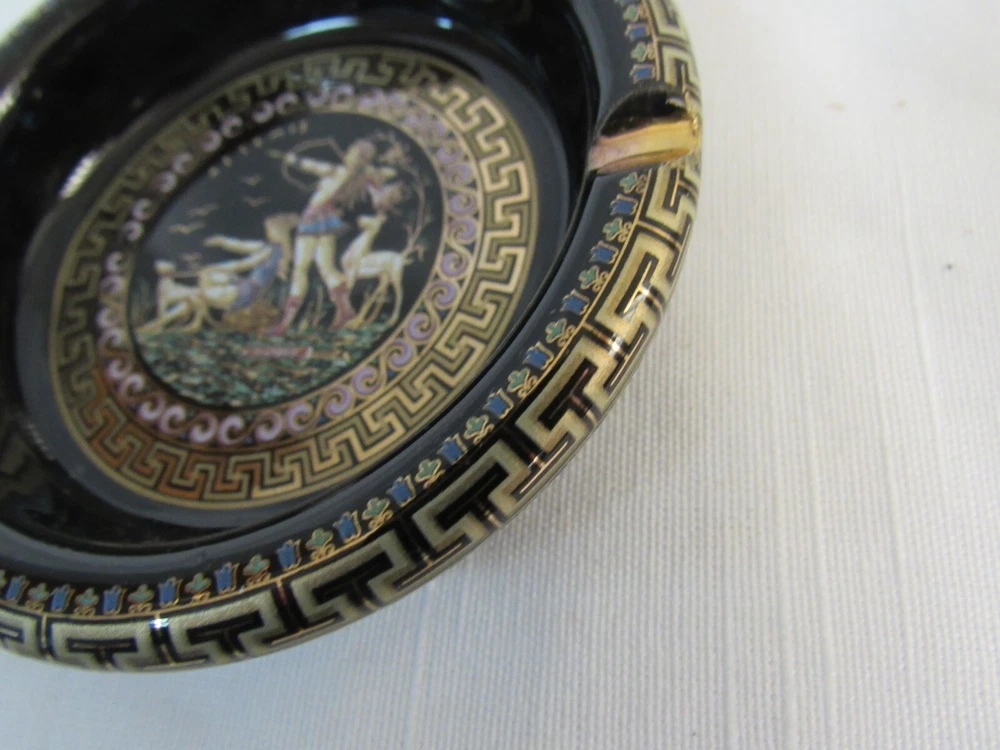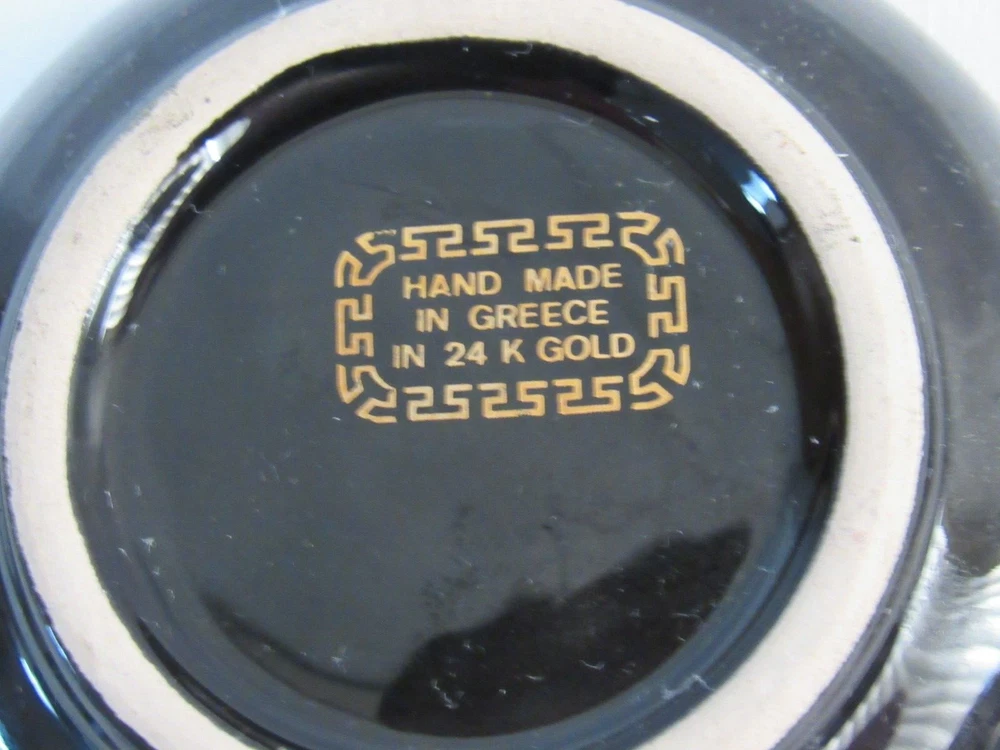 ESTATE LIQUIDATION -------------Fakiolas Ceramics Round Ashtray Handmade In Greece Black With 24k Gold Trim-- no chips, cracks or dings .. see all pics for exact size and condition .........