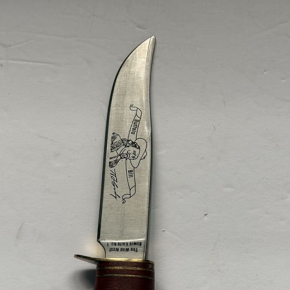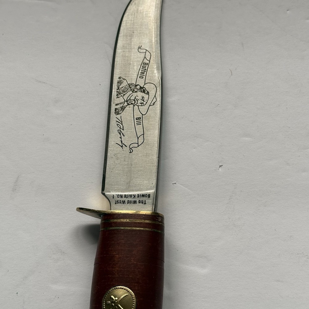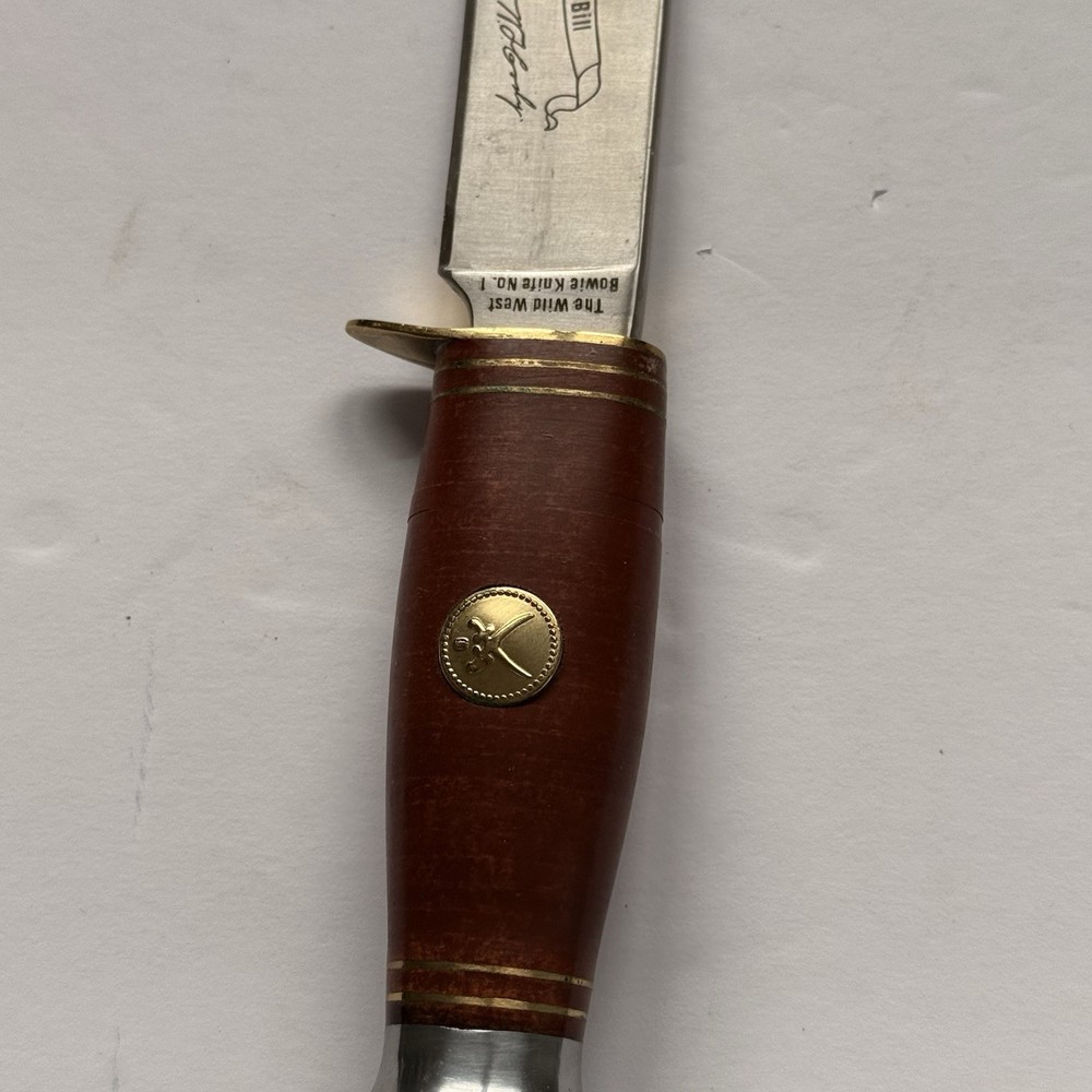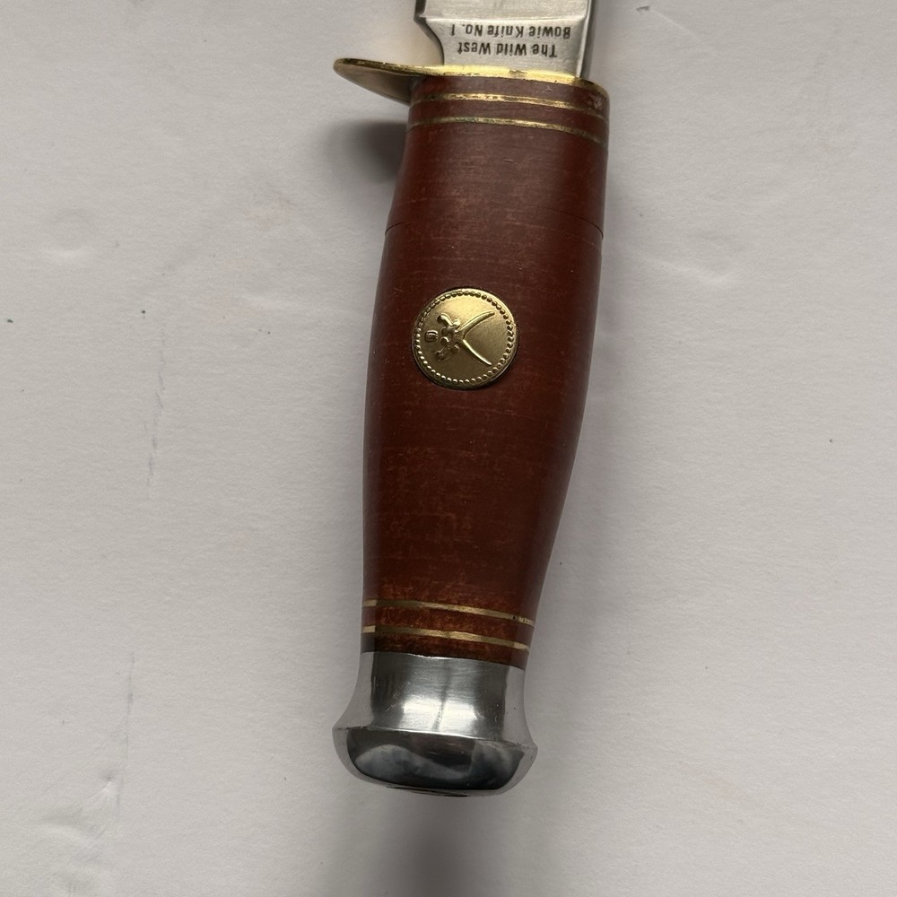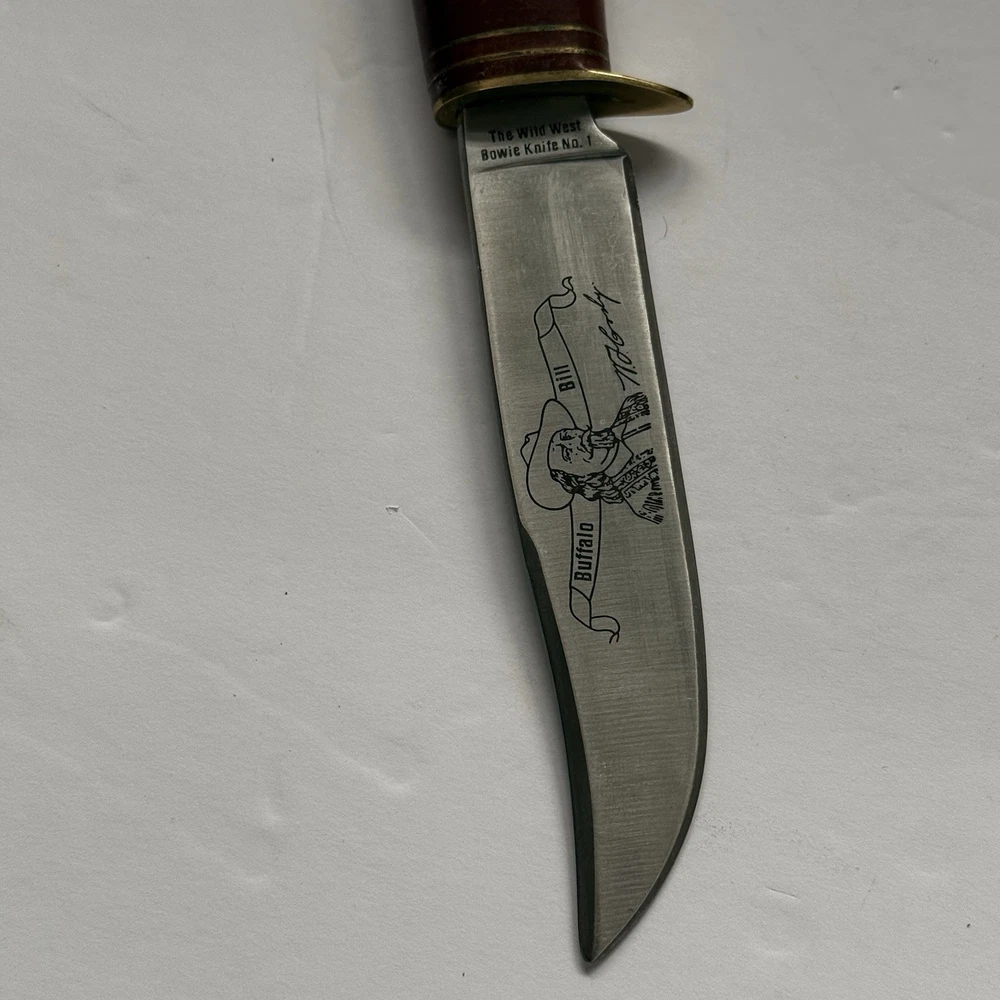The Falkner Wild West Bowie Knife No.1 is a modern fixed blade collectors' knife made of stainless steel with a silver drop point blade and encapsulated tang. This original collectors' edition knife features a wooden handle, ideal for collectors of knives and those interested in the wild west. With a blade length of 4.1 - 5 inches, this knife is a unique and attractive addition to any collection.