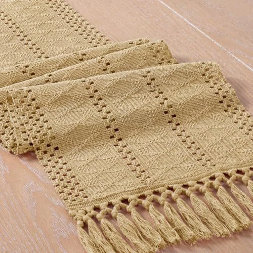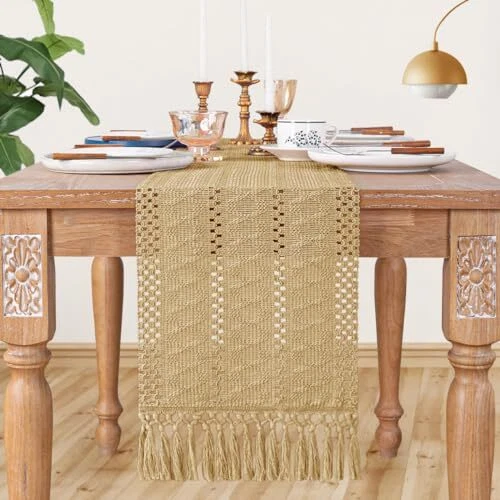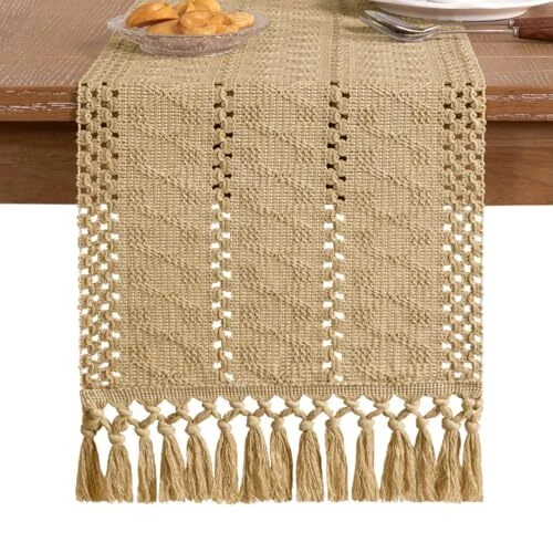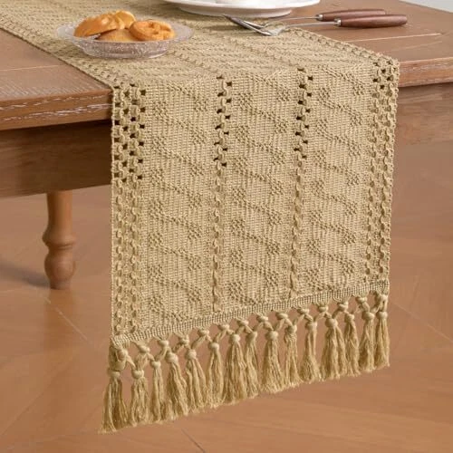 Fall Boho Table Runner Macrame 108 Inches Woven Cotton 12" x 108" Champagne