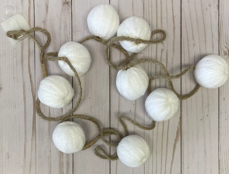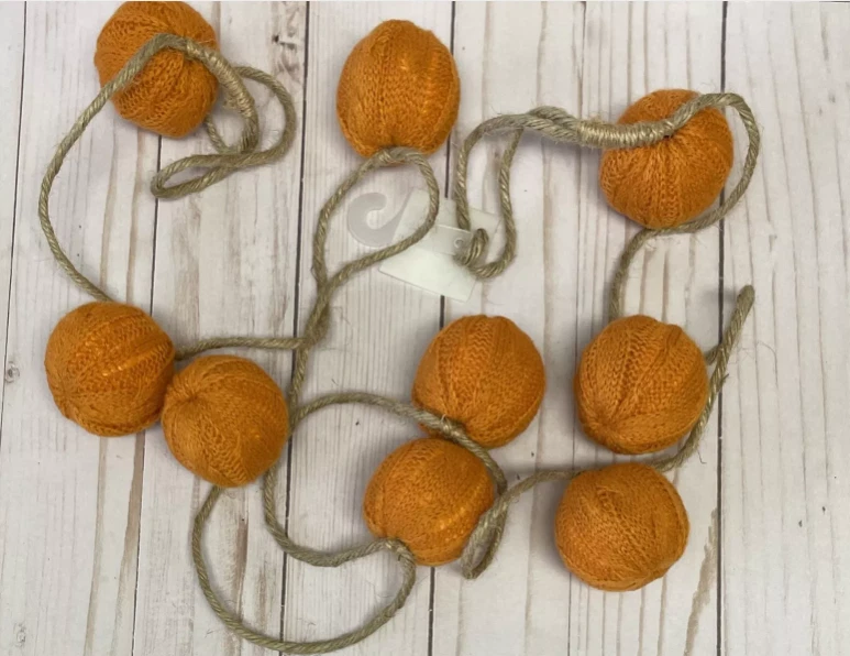 Includes : Brand new cable knit pumpkins garland. Each garland is sold separately. Pattern : Round cable knit "pumpkin" shaped balls on natural jute string. Colors : Ivory or Orange pumpkins. Details : Cable knit pumpkins garland with loops at both ends for hanging. Pumpkins are approx. 2" wide. Jute string. Lightweight, cable knit pumpkins have styrofoam interior. Recommended for indoor use only. Size : 6 foot long (72"). Condition : Brand new with tags.