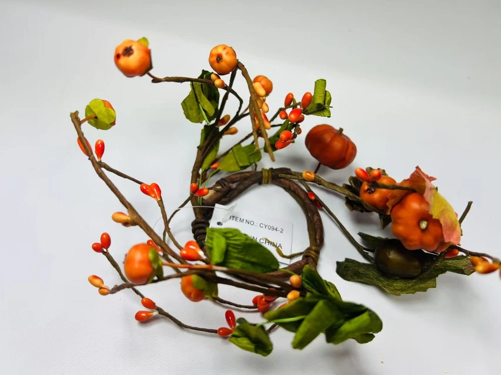 Add a festive touch to your fall decor with this beautiful artificial candle ring featuring lifelike mini pumpkins, berries, pinecones, and colorful fall leaves. Perfectly sized to fit 2.5” candles, it makes a charming centerpiece or accent for mantles, dining tables, and shelves. Crafted with flexible brown-wrapped wire for easy shaping. A great addition to your rustic farmhouse Thanksgiving setup.