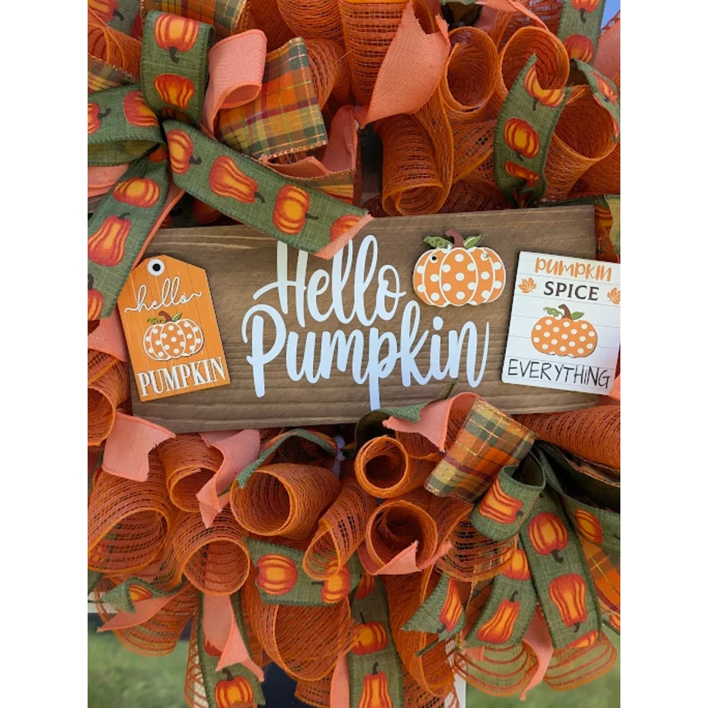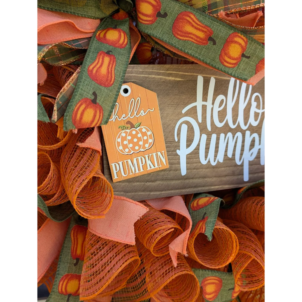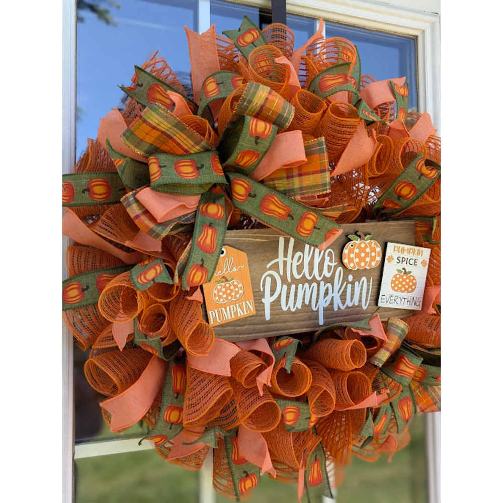 This Fall Wreath is a handmade door decoration perfect for welcoming guests into your home during the fall season. Made from mixed materials including wood and fabric, this orange wreath features a "Hello Pumpkin" sign, adding a charming touch to your front door. The artificial wreath is 23 inches in height and width, making it a striking statement piece for your home decor. Handmade with care in the United States, this seasonal wreath is sure to bring a touch of warmth and cheer to your space. This decorative piece is suitable for any room, porch, or door, adding a welcoming touch to the space. They can be hung anywhere - in a kitchen, living room, family room, bedroom, foyer, or over a mantel or fireplace. And don't forget about gifts for your special person. *I will ship this out the following day. If you have any questions, please don't hesitate to ask. *I'm always open to custom orders. Just message me with your idea, and I'll work with you, and a custom wreath or sign can be yours! *If you favorite my shop, you will see my newly added wreaths and wooden signs that I have made. If any questions, please don't hesitate to ask. I will get back to you. *If displaying outdoors, it's best to bring in your wreath during inclement weather.