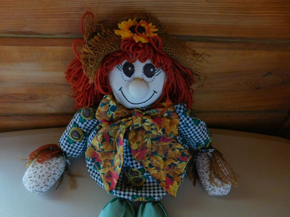 This Cute Scarecrow Shelve Sitter would look great in any room. She has Big Brown Eyes and a Large Smile. Orange Hair and a hat with a Sunflower on it. Her Dress is Green checker with Sunflowers, her legs are solid green and knotted to hang over a shelve with green plaid shoes. Please see all my other Holiday Items in my eBay Store. This is a non smoking home but I do have Pets!! When buying multiple Items please put them in the eBay shopping cart and then request a total-(little tab for total is just above the cost of the first item in your cart)It will save you money on postage. I will combine all auction winnings as you win them and be ready when you check out after your shopping spree is done. I welcome any questions or comments you may have. Payment is due within 3 days after winning the Auction. If you need more time please send me an email and I will be happy to work with you. IF YOU ARE NOT SATISFIED WITH YOUR ITEM(S) PLEASE CONTACT ME THROUGH EBAY WITHIN 2 DAYS AFTER RECEIVING YOUR ITEM(S) ONCE ITEM(S) HAVE BEEN SHIPPED AND IN THE PROCESS OF DELIVERY I HAVE NO CONTROL AND NOT RESPONSIBLE FOR ANY ITEM(S) BEING LOST, STOLEN, OR/AND NOT DELIVERED. Thank you for looking and bidding on my Auction and please view my other Auctions for other Great Deals in my eBay Store, just click on my Store name in the upper right corner of this page.
