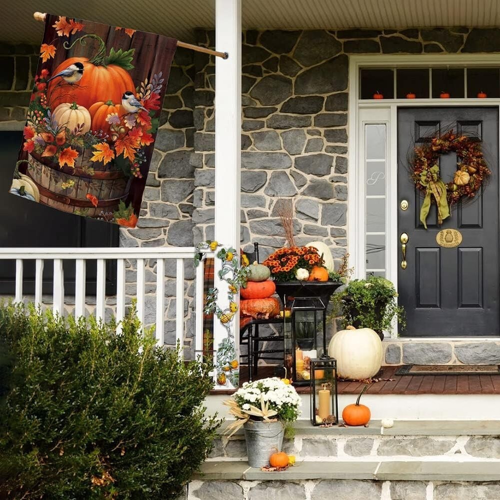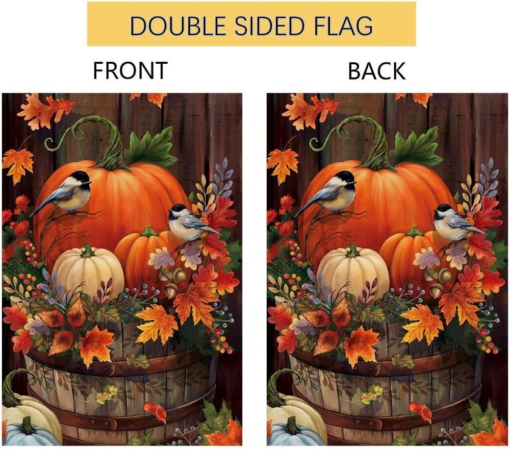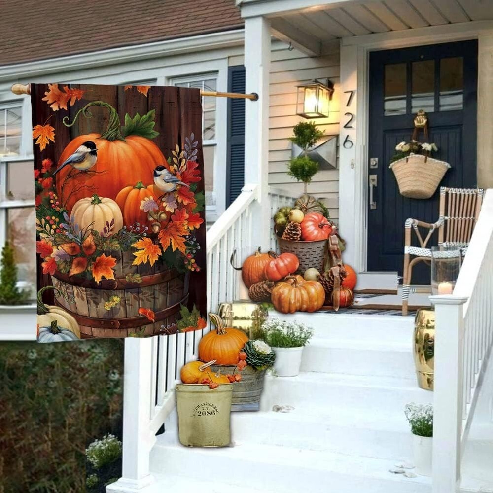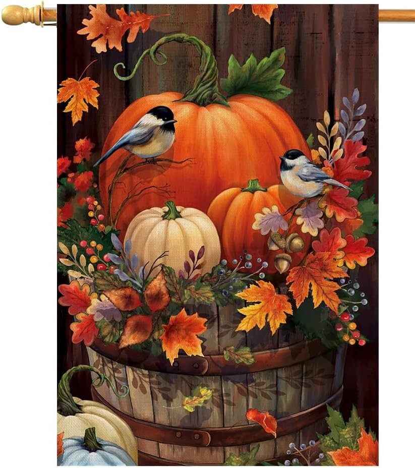 Fall Thanksgiving Pumpkin House Flag 28 x 40 Inch Vertical Double Sided Autumn Watercolor Bird Burlap Yard Outdoor Decor BW044-40 FLAG SIZE: This "Fall Thanksgiving Pumpkin" House Flag is the Large size (28" x 40"). DOUBLE SIDED: Pattern available in both house flags are printed via sublimation printer and then heat pressed onto burlap that may be hung inside or out. MATERIALS: two layers of burlap, weather and fade resistant to keep them flying for many seasons. INCLUDES: ONLY HOUSE FLAG,FLAG POLE NOT INCLUDED (This house flag has an anti-skid hook, which can be hung on the flagpole to prevent sliding, house flag for use with any standard house flag pole). OCCASSION: burlap house flags perfect for any deck, patio, porch or veranda and make charming decorative statements for any backyard, lawn or garden. Fall Garden Flag Effortless way to pop your front yard.
