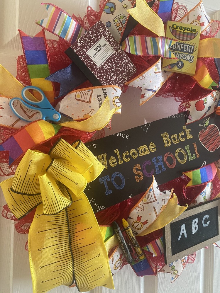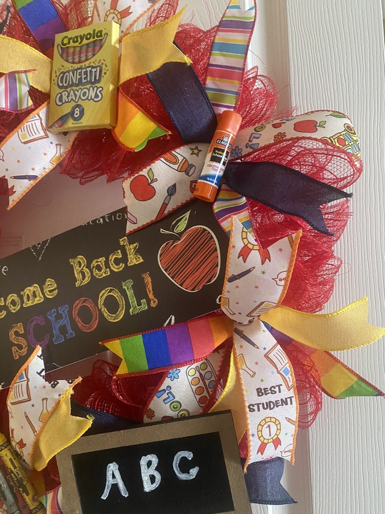 Get ready for the school year with this beautifully crafted handmade wreath hanger. Perfect for decorating your classroom or front door, this wreath features a vibrant multicolor design made with deco mesh, ribbons, and school supplies. Measuring 24 inches in diameter, this artificial wreath is sure to add a festive touch to any space. Designed for the back to school occasion, this wreath is a great way to welcome students and staff to your school. The United States-made wreath is perfect for those looking for a high-quality and unique door decoration. Add this welcome back to school teacher fall wreath to your collection today!
