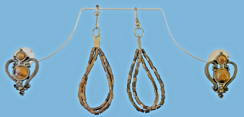 Get ready for fall with these two stunning pairs of earrings! The first pair features Tiger's Eye stones set in a warm bronze-tone setting, radiating earthy, golden hues that capture the essence of autumn. The natural stone's rich colors are beautifully complemented by the vintage-inspired bronze design, making them a perfect accessory for the season. The second pair offers a fun and stylish look with delicate bugle bead danglers, adding movement and sparkle to your ensemble. These lightweight earrings feature shimmering beads that catch the light and create a lovely, cascading effect. Both pairs are ideal for adding a touch of elegance and charm to your fall wardrobe, whether you're dressing up for an event or adding a bit of seasonal flair to your everyday outfits. A perfect duo for autumn jewelry lovers