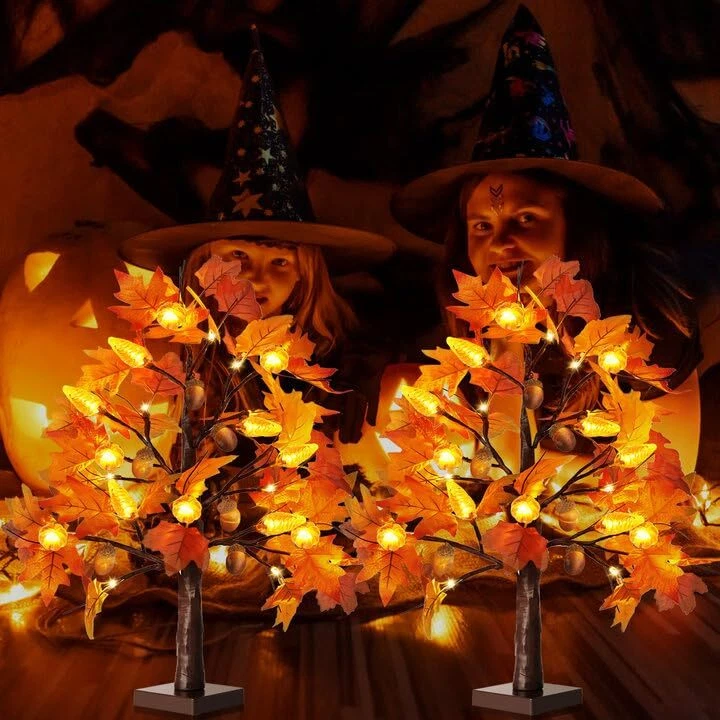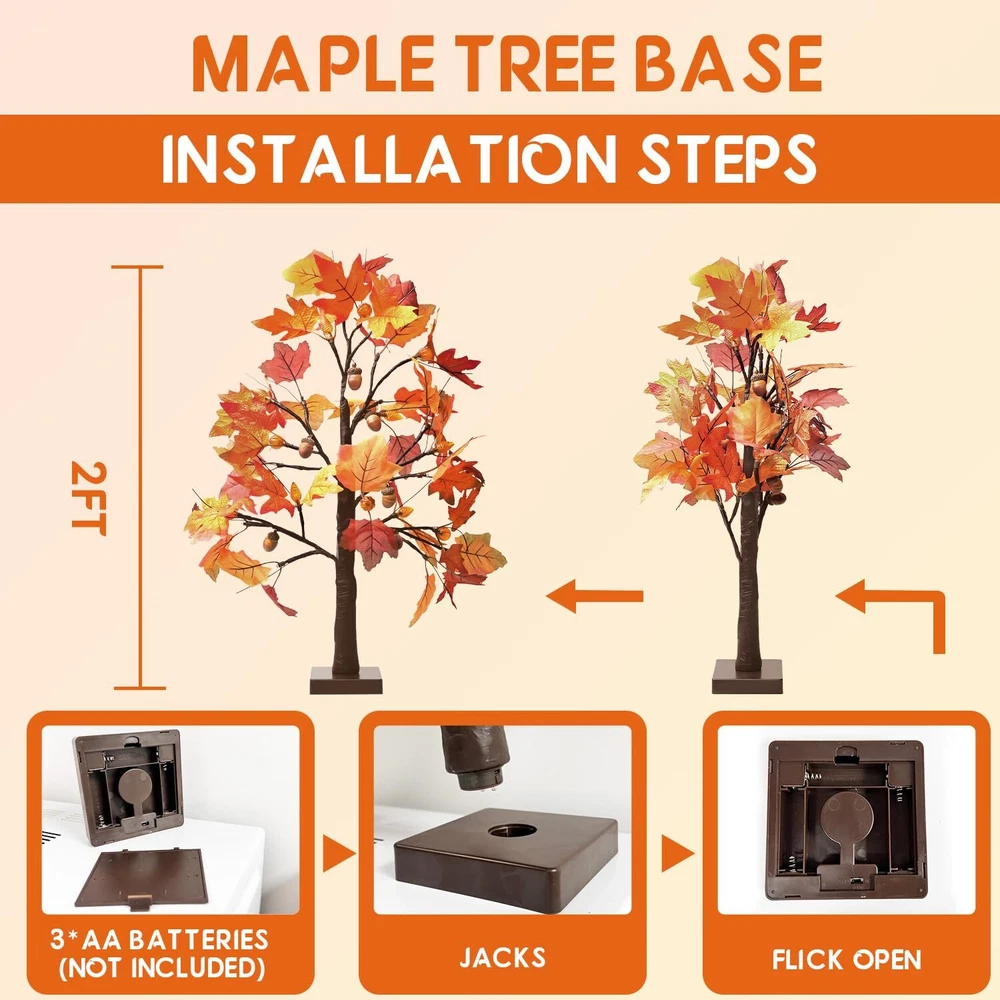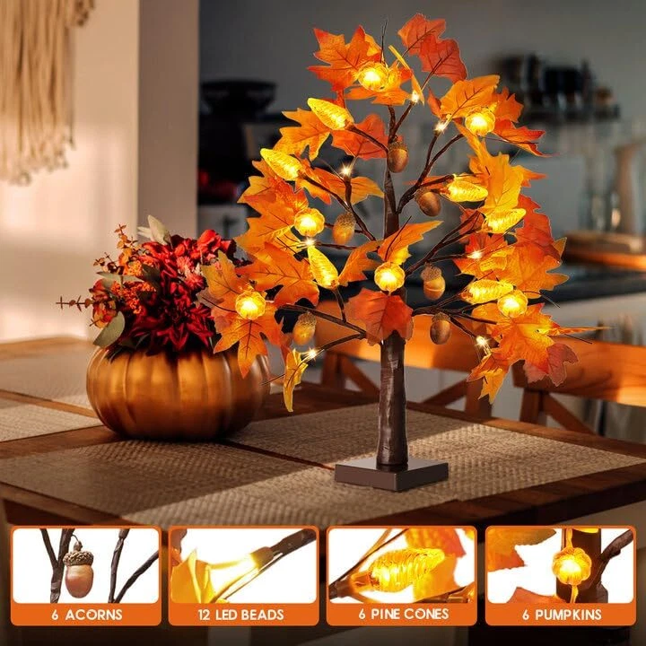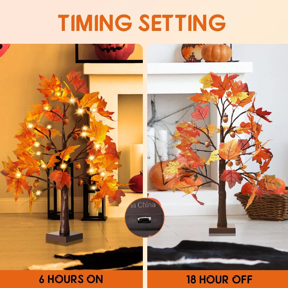 Thanksgiving Home Decorations: This fall tree with lights can be used as a tabletop tree light for fall Thanksgiving decorations, can be used to decorate furniture, tables, porches, rooms, indoor and outdoor, party places. This fall decorations is battery powered and can be placed indoors and outdoors in covered areas for decoration. This indoor fall decorations for home is used to create warm atmosphere of fall Thanksgiving, so that you and your family can have a pleasant fall harvest festival. Fall Tree Lights: This artificial fall tree comes with two products per pack, each Thanksgiving Tree measures 24 inches in height with a removable battery box base. Each autumn tree has 12 pairs of red and yellow maple leaves and 12 pairs of gold red and yellow maple leaves, 24 LED light beads, 6 realistic plastic acorns, 6 orange threaded pine cones, and 6 orange clear pumpkins. The fall trees with lights can add the festive factor of fall Thanksgiving and can provide a cozy vibe. Battery Operated and 6-Hour Timer: Each fall light up tree needs to be powered by 3 AA batteries to be applicable (Batteries are not included in the product), so this thanksgiving tree can be used without a cord, say goodbye to the hassle of using it next to an electrical outlet only, and you can place it wherever you want. This lighted maple tree has two different modes: constant light and timer; The fall lit tree turns on the timer for 6 hours of constant light 18 hours of automatic shut off. Adjustable DIY Branch: This fall party ornaments uses adjustable branches for your personal DIY needs, with do-it-yourself design, you can bend and adjust the branches to the shape you want so that you can put the fall centerpieces for tables where you need them. Meanwhile, you can hang something lightweight on your fall tree to design your unique style and add touch of holiday cheer to your Thanksgiving. This artificial fall lighted maple tree can be your fall gifts for your family and friends. Multi-Purpose Lighted Fall Tree: During the daytime the fall tree can be used as a thanksgiving decorations indoor, and at night light up fall tree can create a warm fall atmosphere and add an autumnal touch; the fall lighted maple tree can be used in a variety of settings, incorporating into your fall themed arrangement for a stunning focal point, the maple tree is a perfect fall decor. Each product includes 2 Thanksgiving autumn harvest trees.