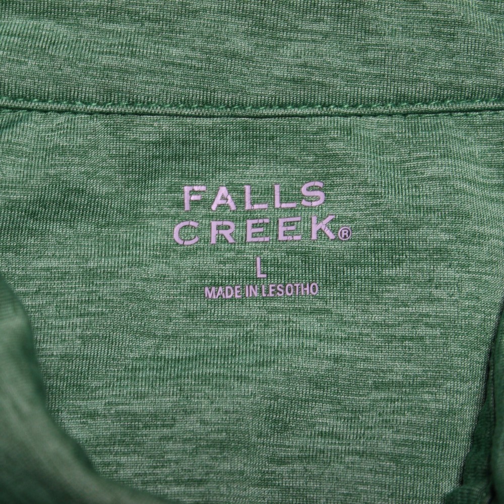 Comfortable and lightweight Falls Creek polo shirt in men’s size large. This short sleeve shirt features a heathered green color, three-button placket, and stretch fabric for casual everyday wear or light activity like golf. Soft and breathable with a classic fit. Brand: Falls Creek Size: Large Fit: Regular Color: Heathered Green Material: Polyester/spandex blend (tag not shown, inferred from fabric feel) Features: Stretch fabric, short sleeves, three-button collar Measurements (approximate): Chest: 23" pit to pit Length: 30" shoulder to hem Condition: Excellent pre-owned condition with no stains or holes. Lighting Note: Color may vary slightly due to lighting differences during photography.
