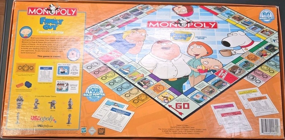 The Family Guy Monopoly Collector's Edition Board Game from 2006 is a unique twist on the classic Monopoly game, featuring characters and elements from the popular animated TV show. This collectible edition includes special themed properties and gameplay rules that incorporate the humor and charm of the Family Guy franchise. Perfect for fans of both Monopoly and the show, this brand new board game offers a fun and entertaining way to spend time with family and friends.
