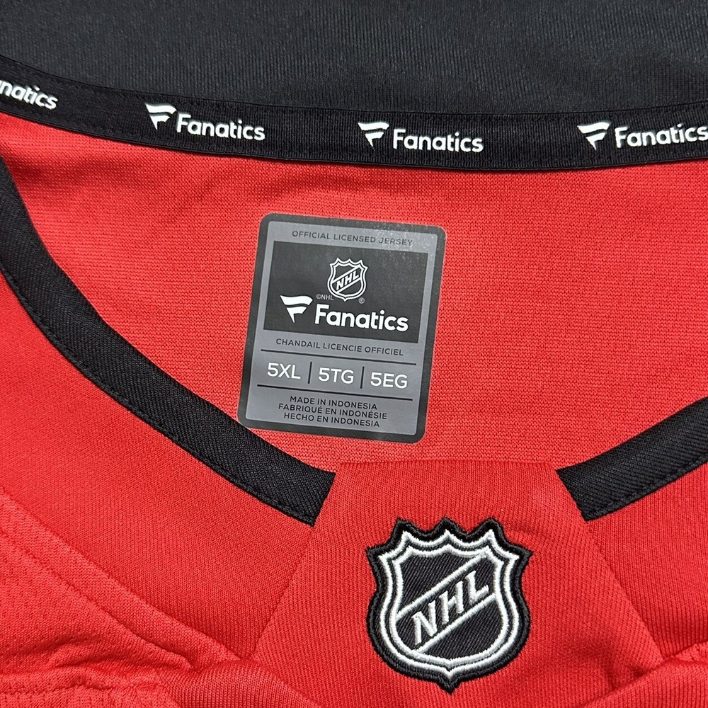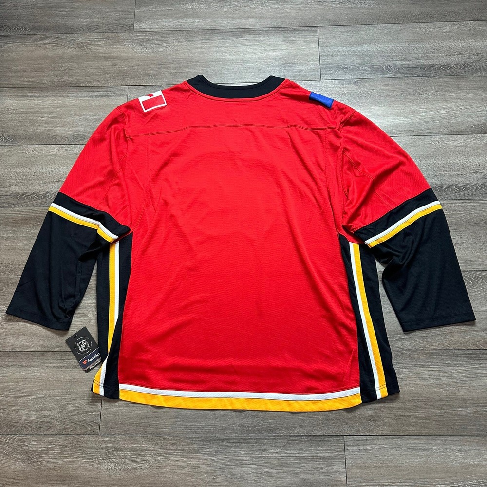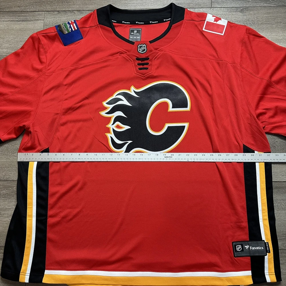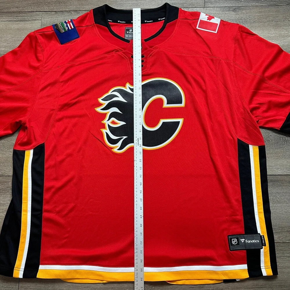 Team:Calgary FlamesOfficially Licensed:YesColor:RedProduct:JerseyCountry/Region of Manufacture:IndonesiaSKU:781Gender:MenSport:HockeyPre & Post Season:Regular SeasonLeague:National Hockey League (NHL)Size:5XLBrand:Fanatics
