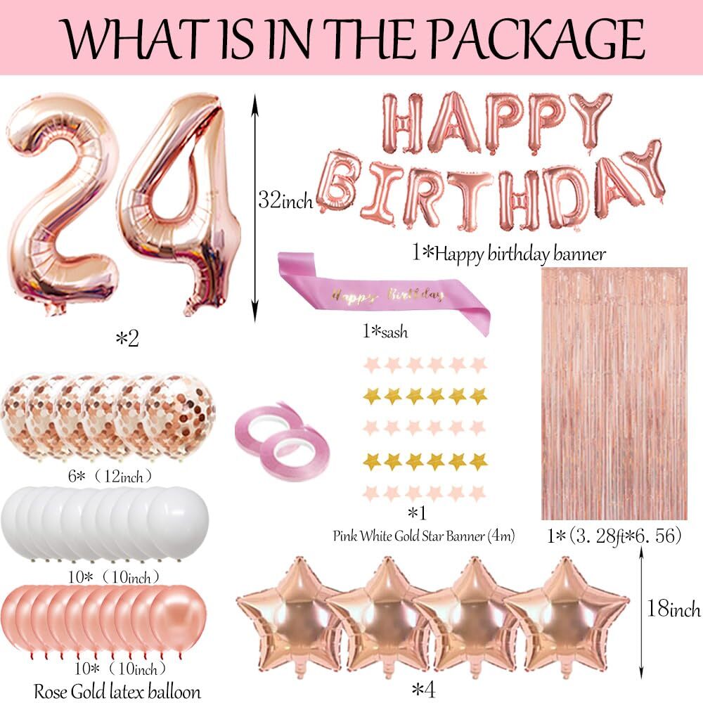 Fancypartyshop 24th Birthday Decorations - Rose Gold Happy Birthday Banner and Sash with Number 24 Balloons Latex Confetti Balloons Ideal for Girl and Women 24 Years Old Birthday Rose Gold Package Include: 1.1 x "HAPPY BIRTHDAY" Banner foil balloons Rose gold--16inch 2.1 x "HAPPY BIRTHDAY" Sash Rose gold 3.4 x star shape Foil Balloons,rose gold--18" 4.2 * Number Foil Balloons,rose gold--32" 5.2 * Champagne bottle goblets Balloons--40" 6.10 * Latex Balloons.rose gold--10inch 7.6 * Latex Balloons,rose gold--12" 8.10 * Confetti Balloons, rose gold--inch" 9.1 * Tinsel Foil Fringe Curtains--40inch x 80inch 10.1 * star hanging paper banner(gold&pink)--length=4m 11.straws and ropes-1 【HAPPY 24TH BIRTHDAY】- Designed for your 24TH birthday party.The set contains everything you will need.And can be used to celebrate the 24TH birthday(Just swap the numbers). 【VALUE PACK】- As the picture appeared,the package includes:1 x "HAPPY BIRTHDAY" Banner ,star hanging banner(4m),happy birthday sash,number 2+4 foil balloons and star ballons(18inchx4pcs),26pcs latex and confetti balloons,Foil Fringe Curtains and more. 【HIGH QUALITY】- Made from high quality material. All balloons from this set are non-toxic, safe,durable,Easy and fun to hang and assemble. 【USE TIPS】-No need to assemble, use a straw to blow the foil balloon,With self-sealing function, and then use a rope to hang them. You can also use glue to fix that on the wall. Many balloons can form the shape you want, easy to use. 【RISK-FREE WARRANTY】- Each product has been carefully inspected and can be purchased with confidence. Once you have any questions, we will refund unconditionally, so that you are 100% satisfied. Shipping from the USA All of our products are shipped from the USA, ensuring quick delivery to your destination. Payment We offer the following payment methods: PayPal, credit card, bank transfer, and eBay's secure payment system. Free Shipping & Free Returns Shipping within the USA is FREE. Additionally, any return is absolutely free for you. Risk-Free Purchase You have the option to return an item within 30 days without any justification. We cover the return shipping costs! Fast Shipping We ship immediately upon receipt of payment. Generally, the package is delivered within 2-3 days in the USA. If it takes longer, we will contact you. Quality and Costs Made in Europe, USA, China No customs fees or additional charges Total satisfaction guarantee Invoice with declared VAT available upon request in .pdf format Feedback Your feedback is very important to us. After you pay for your purchase, you will automatically receive positive feedback from us.