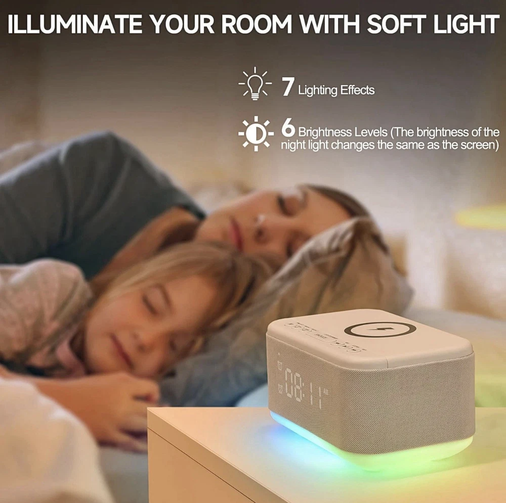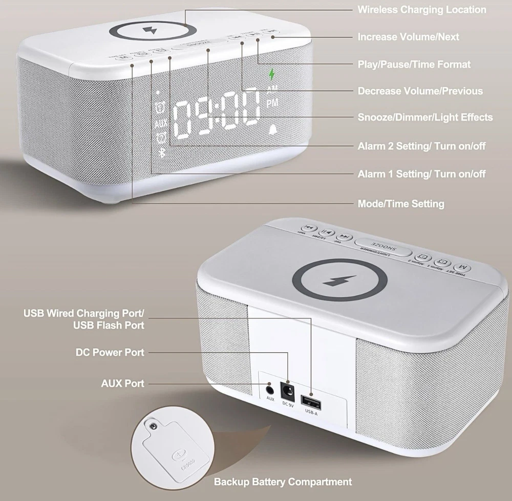 Fansbe Tech Alarm Clock Speaker Wireless Charger, Digital Alarm Clocks Bedrooms Bluetooth, Alarm Clock Dimmable Light Bedrooms Dual Alarm Snooze Dimmer 12 24H RGB Night Light Bluetooth USB AUX, White Make Your Alarm Clock Blend Seamlessly into Your Daily Routine. This alarm clock for bedrooms quickly syncs with your life. Once connected via Bluetooth, it intelligently syncs with the time of your Bluetooth device, providing you with a faster time setup. With a one-touch switch between the 12/24-hour format, it quickly adapts to your preferred mode. Featuring six adjustable screen brightness levels, from complete darkness to the brightest state, it caters to your diverse needs Start Your Morning with Ease This digital alarm clock for bedrooms offers dual alarm functionality, allowing you to effortlessly set and control two alarms independently. The dedicated large snooze button enables you to activate a 9-minute snooze even in a half-asleep state, ensuring you wake up on time after a little extra rest. Additionally, the alarm clock is equipped with six commonly used ringtone options for you to choose your favorite wake-up sound Multifunctional Audio Bluetooth Alarm Clock Beyond meeting your alarm clock needs, it can also function as computer speakers. Connect via Bluetooth 5.0, AUX, or USB to play music. The two built-in 5W high-quality speakers make the ringtone clearer and provide immersive surround sound during music playback. Also, the high-quality speakers make the alarm clock ringing clear and pleasant, allowing you to wake up to comfortable music Multicolored Night Light Function This bedside alarm clock has an RGB light strip that can switch between multiple light modes. Three gentle night light modes are suitable for nighttime illumination, reading, and aiding sleep. Three RGB dynamic light modes synchronize with music, dual-color changes, and breathing lights, injecting different colors into your moments of relaxation. Alarm clock with lights are more in line with modern living habits and bring people a warmer living environment Convenient Charging Design This bedside alarm clock for bedrooms supports both wireless and wired charging. Wireless charging frees you from cumbersome data cables and sockets, allowing you to wake up to a fully charged phone. The alarm clock with usb ports provides more charging possibilities for devices that do not support wireless charging. Whether it's your smartphone, smartwatch, or other Qi-enabled devices, our alarm clock with wireless charging has you covered