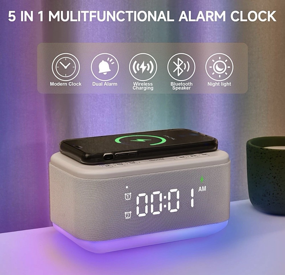 1. This alarm clock is a game-changer! The wireless charging is super convenient, and the Bluetooth sync makes setup effortless. The dimmable display and dual alarms are perfect for different wake-up times, and the RGB night light adds a cozy touch. It looks sleek in white and blends perfectly into my bedroom. The sound quality is great, and the USB/AUX options make it versatile. A must-have for anyone who wants a stylish, functional clock!