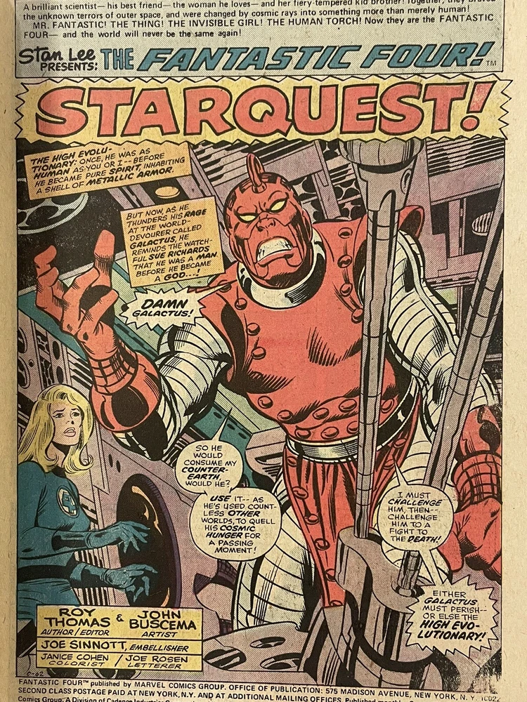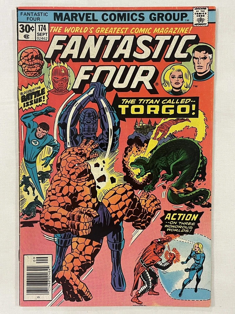 Series Title:Fantastic FourEra:Bronze Age (1970-83)Character:Human Torch (Johnny Storm), Skrulls, The Thing (Ben Grimm), High Evolutionary, Invisible Girl, Gorr, Mister Fantastic, Torgo, GalactusCover Artist:Frank Giacoia, Jack KirbyPublication Year:1976Issue Number:174Genre:SuperheroesPublisher:Marvel ComicsSuperhero Team:Fantastic FourTradition:US ComicsLanguage:EnglishArtist/Writer:Janice Cohen, Roy Thomas, Joe Sinnott, John Buscema