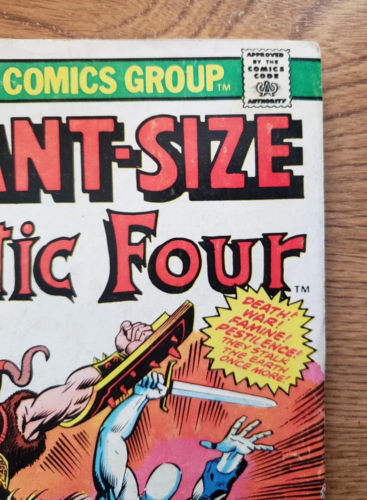 Ex Libris:NoType:Comic BookUnit of Sale:Single UnitCountry/Region of Manufacture:United StatesLanguage:EnglishStyle:ColorCover Artist:VariousEra:Bronze Age (1970-83)Grade:4.0 Very GoodSeries Title:Fantastic FourArtist/Writer:VariousVintage:YesFeatures:First Printing, Annual, Boarded, Collector's Edition, Double Edition, Dust Jacket, First Character Appearance, Vintage PaperbackIntended Audience:General AudiencePersonalized:NoSigned:NoTradition:US ComicsCharacter:Human Torch (Johnny Storm), Invisible Woman, Mister Fantastic, The ThingGenre:Action, Adventure, SuperheroesInscribed:NoStory Title:The Four Horsemen Of The Apocalypse!Format:SoftcoverPublisher:Marvel ComicsPublication Year:1974Universe:Marvel (MCU)Issue Number:3Superhero Team:Fantastic Four