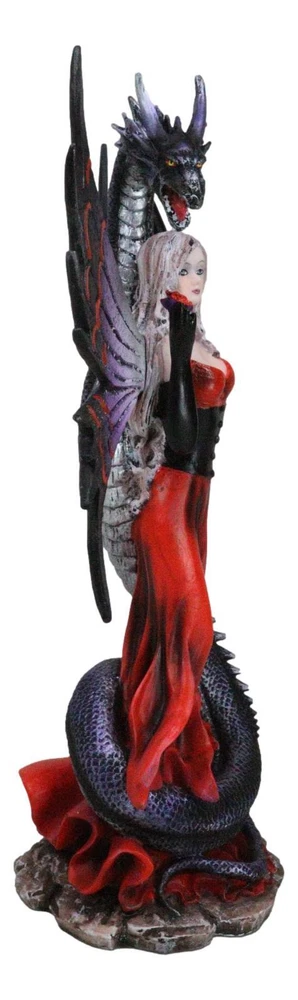 • This Gothic Fairy With Black Dragon Statue is approximately 9.25" tall, 6" long and 3" deep. It weighs about 1 pounds. • This Gothic Fairy With Black Dragon Statue is made of designer composite resin, hand painted and polished individually. Color Tone may vary slightly from pictures. • Indulge in the dark allure of our Red Gowned Gothic Rose Fairy with Black Grendel Dragon Figurine, a captivating blend of mystery and fantasy. This intricately crafted figurine features a gothic rose fairy adorned in a striking red gown, accompanied by a majestic black Grendel dragon. The exquisite details and contrasting colors create a mesmerizing and enchanting tableau.
