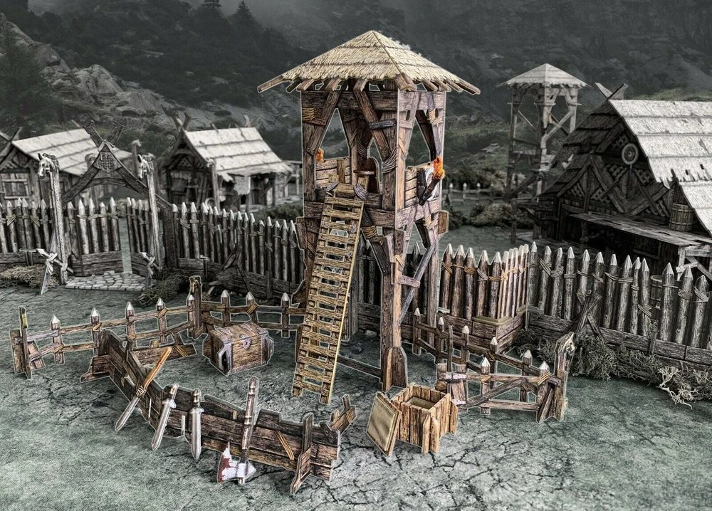 Fantasy Terrain Lookout Tower - D&D Warhammer DND Town Village Fort Scenery THG This box contains everything you need to build a wooden lookout tower, suitable for many 28-35mm fantasy & historical games. The set comes complete with scatter terrain to accessorize your table. Many of the pieces are modular & can be assembled in different combinations or mixed & matched with the rest of the range. The terrain is supplied flat-packed on high-quality, high-density card, printed in full color on both sides, so no painting required! The terrain requires assembly, & some smaller parts will require glue. CONTENTS - 1 Lookout Tower -- 4 Side Panels -- 1 Platform -- 1 Roof -- 1 Roof Clip -- 1 Ladder - 4 Fence Sections - 1 Short Palisade Section - 21 Assorted Scatter Components & Accessories -