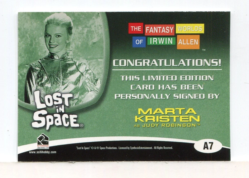 Description: Fantasy Worlds of Irwin Allen Lost in Space Marta Kristen Autograph Card A7 Contents: Authentic autograph card A7 featuring Marta Kristen as Judy Robinson. Manufacturer: Rittenhouse Archives, 2004. Condition: Mint/near mint.