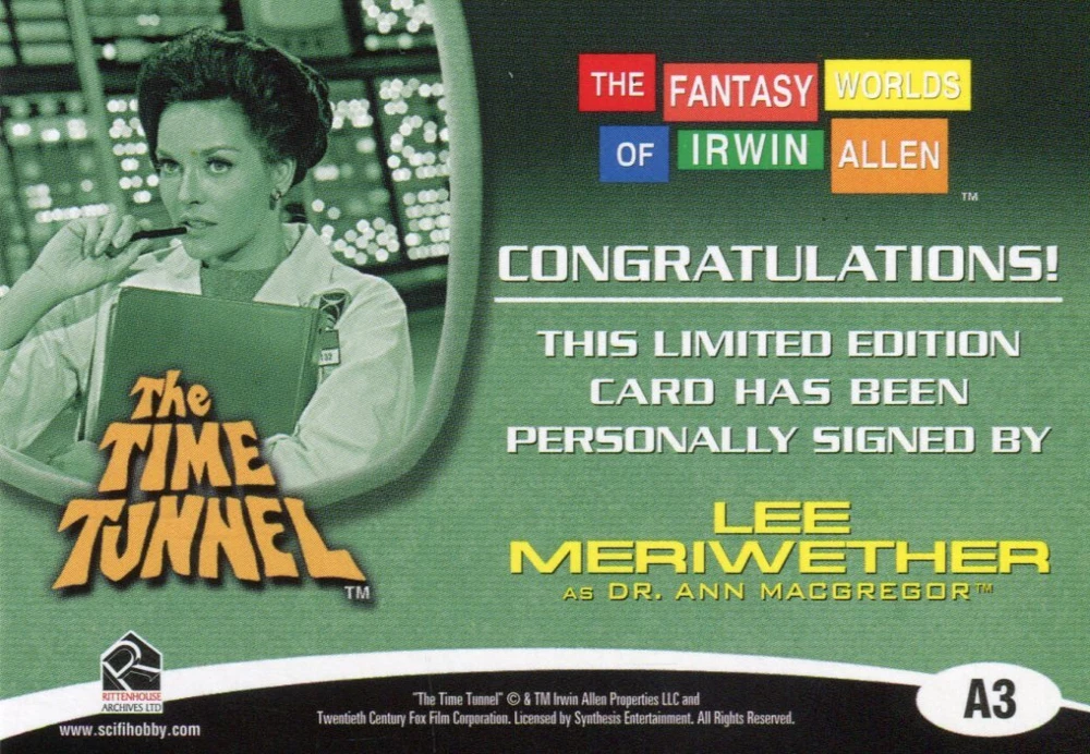 Description: Fantasy Worlds of Irwin Allen The Time Tunnel Lee Meriwether Autograph Card Contents: Authentic autograph card A3 featuring Lee Meriwether as Dr. Ann MacGregor in the television series "The Time Tunnel." Manufacturer: Rittenhouse Archives, 2004. Condition: Mint/near mint.