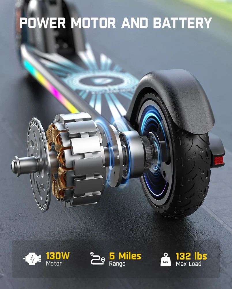 FanttikRide Electric Scooter for Kids Bluetooth Music Speaker & 6 Lights Modes: The kids' electric scooter has a Bluetooth music speaker that plays music while riding. It features rainbow lights with 6 modes that sync to the music, attracting attention and improving safety during night rides Versatile Speed & Battery Display: The electric scooter for kids offers three speeds(5 mph/ 8 mph/ 10 mph) selections that are very suitable for children. The LED display shows the battery power, pedal mode, and riding speed at any time Adjustable Handlebars for Variable Ages: The kids scooter handlebar height can be adjusted to 31.7 "/34.1 "/36.5 " according to your child's height. It is designed to fit children 3.9 - 5.2 feet tall, kids 8 - 12 years old, and under 132 lbs (60 kg) Foldable & Portable: The electric scooter is very easy to assemble. It can be easily folded and unfolded in one step, making it super portable and easy to store. Making it ideal for carrying on public transportation or storing it in the trunk of a car Safe Riding: 6 in rubber anti-skid wheels provide smoother and more comfortable ride. Its rear fender brake provides fast braking. The electric scooter motor will only start when the G-sensor switch on the deck is turned on and the speed increases to 3 mph About Endurance: Kids weight 90 lbs riding this electric scooter will travel 5 miles, up to 40 mins. Kids weight 110 lbs riding this electric scooter will travel 4 miles, up to 30 mins