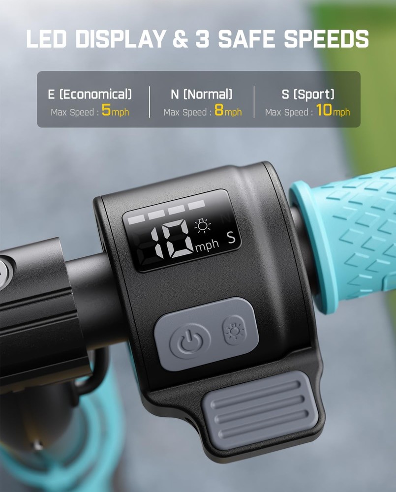 This electric scooter is a blast for kids! The Bluetooth speaker and rainbow light show make rides super fun, while the adjustable speed settings ensure safety. The LED display keeps track of battery and speed, and the sturdy build gives parents peace of mind. Perfect for young riders who want style and excitement!