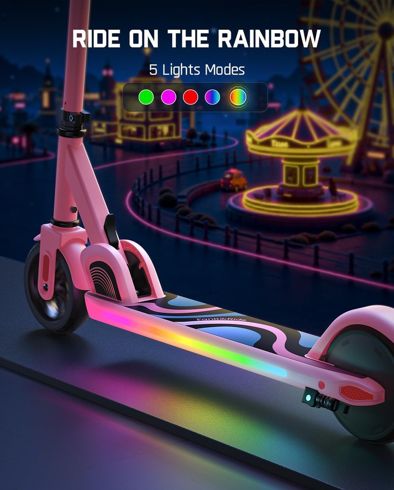 FanttikRide Electric Scooter for Kids C9 Pro Ages 8-12- Pink Fun & Safety: There are flashing LED lights (5 lights modes) next to the pedals of the kids scooter, making children's childhood full of joy. It can attract the crowd's attention, remind other vehicles to keep their distance and make night riding safer Versatile Speed & Battery Display: The electric scooter for kids offers three speeds(5 mph/ 8 mph/ 10 mph) selections that are very suitable for children. The LED display shows the battery power, pedal mode, and riding speed at any time Adjustable Handlebars for Variable Ages: The kids scooter handlebar height can be adjusted to 31.7 "/34.1 "/36.5 " according to your child's height. It is designed to fit children 3.9 - 5.2 feet tall, kids 8 - 12 years old, and under 132 lbs (60 kg) Foldable & Portable: The electric scooter is very easy to assemble. It can be easily folded and unfolded in one step, making it super portable and easy to store. Making it ideal for carrying on public transportation or storing it in the trunk of a car Stability & Endurance: 6 in rubber anti-skid wheels provide a smoother and comfortable ride; rear fender brake provides fast braking.Kids weight 90 lbs riding this electric scooter will travel 5 miles, up to 40 mins. Kids weight 110 lbs riding this electric scooter will travel 4 miles, up to 30 mins
