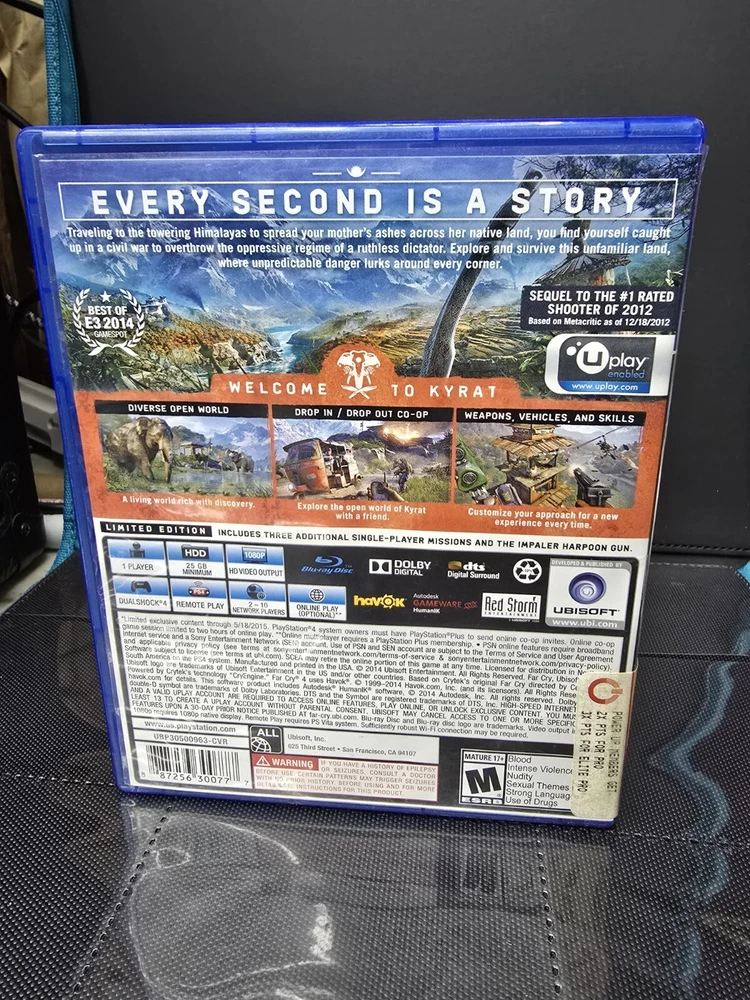 Publisher: Ubisoft Rating: M - Mature gtin13: 887256300777 Release Year: 2014 Features: Walmart Edition Platform: Sony PlayStation 4 Game Name: Far Cry 4 Video Game Series: Farcry UPC: 887256300777 Genre: Action & Adventure, Arcade, Shooter