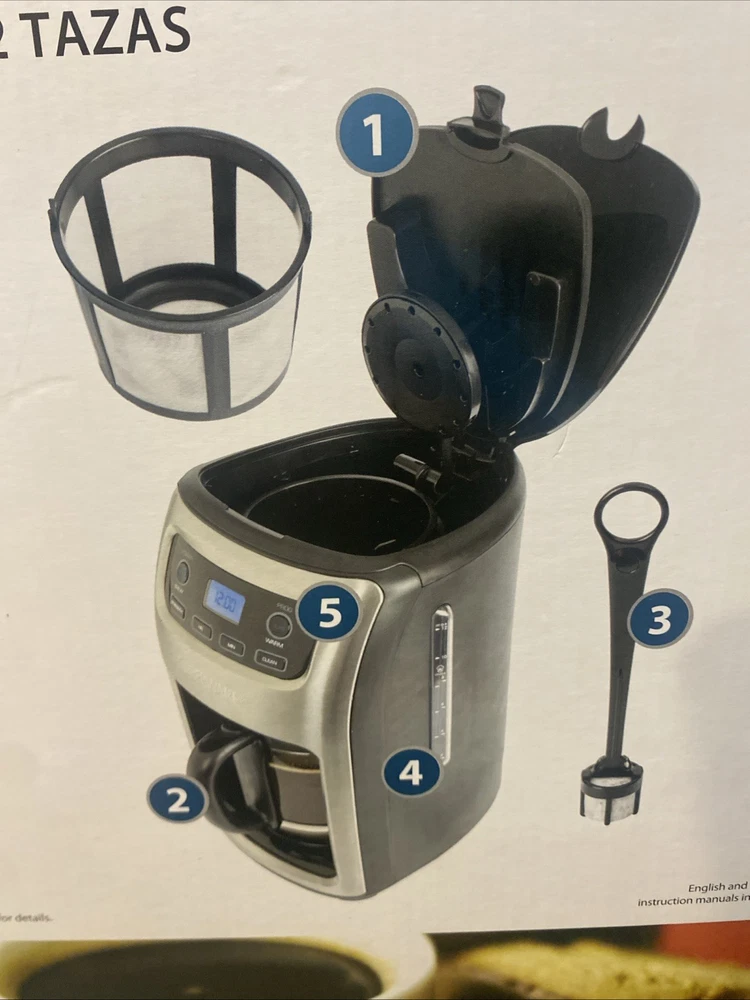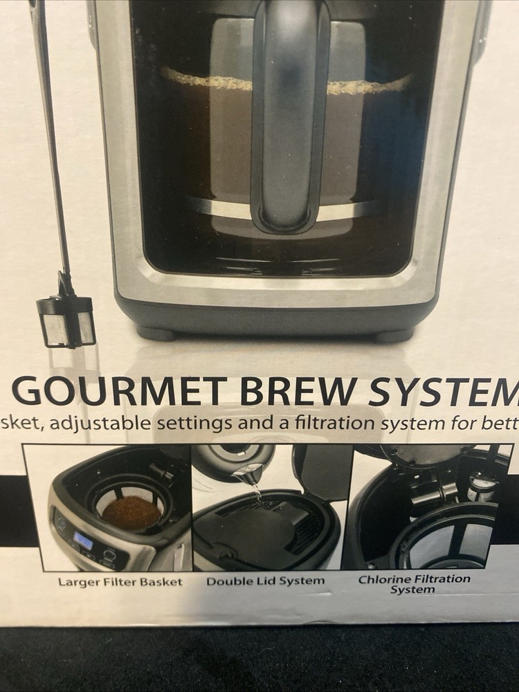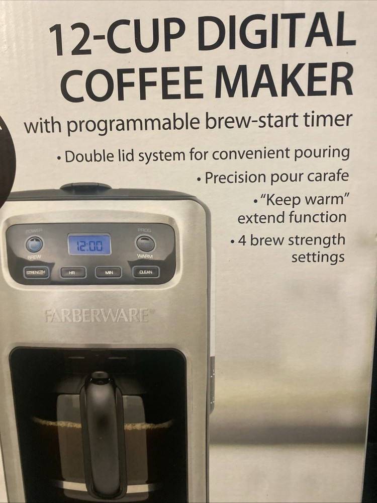 The Farberware 12 Cup Gourmet Brew System Digital Coffeemaker is a sleek silver coffee maker with a removable filter basket and programmable features. It has a digital control panel for easy use and an auto shut-off function for safety. This new open box appliance by Farberware is perfect for brewing delicious filter coffee with its convenient design and advanced settings. Excellent unused condition in open box