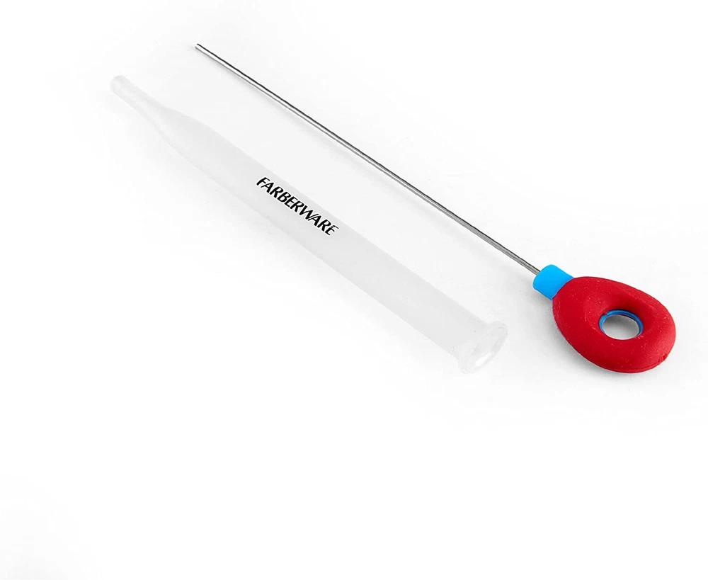 Farberware Baker's Advantage Cake Tester with Cover This Farberware Baker's Advantage Cake Tester with Cover helps to gauge when your cake or cupcakes are ready to come out of the oven. Tester features a soft grip handle for a comfort hold and a stainless-steel wire that inserts into the center of the cake or cupcake. If it comes out clean, your cake is done! Includes a handy cover for storage. Dishwasher safe. Cake tester measures 6 inches long. FEATURES : This cake tester helps to gauge when your cake or cupcakes are ready to come out of the oven Tester features a soft grip handle for a comfortable hold and a stainless steel wire Includes a handy cover for safe storage Insert the wire into the center of the cake or cupcake, if it comes out clean, your cake is done Dishwasher safe; cake tester measures 6 inches long COLOR: Clear Red and Blue MATERIAL : Plastic WHAT'S IN THE BOX: (1) Farberware Baker's Advantage Cake Tester with Cover