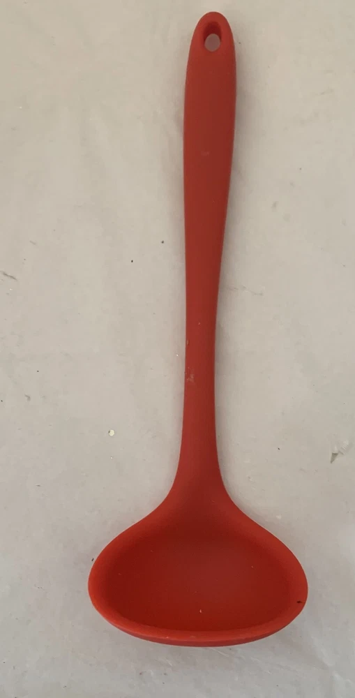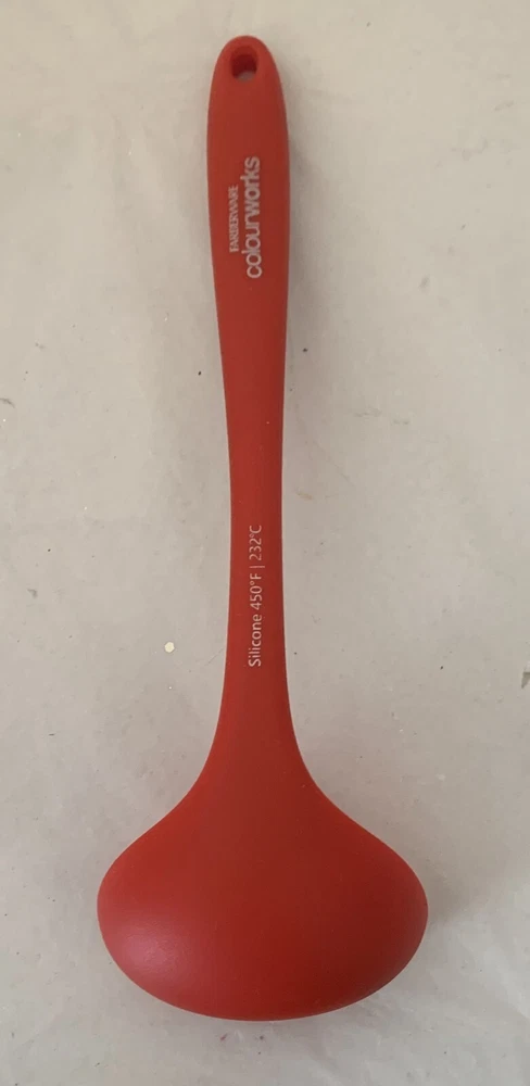 The Farberware Colourworks Silicone Ladle is a red kitchen utensil made of silicone, known for its durability and heat resistance. This ladle is a part of the Farberware brand, known for producing high-quality kitchen tools and gadgets. The ladle is designed for cooking and serving soups, stews, and other dishes, with the silicone material being gentle on nonstick cookware. Its bright red color adds a pop of color to any kitchen and makes it easy to spot in a utensil drawer or utensil holder. 8.5" long Cup 1" deep 2" wide 2.5" long