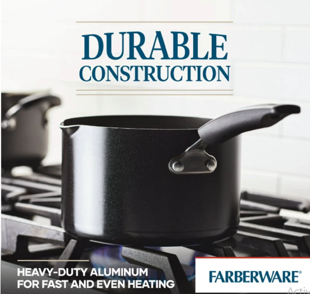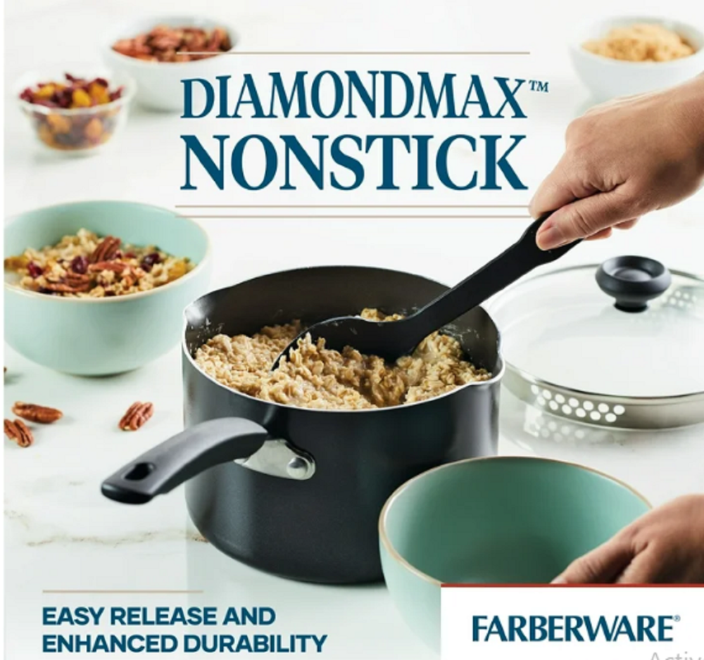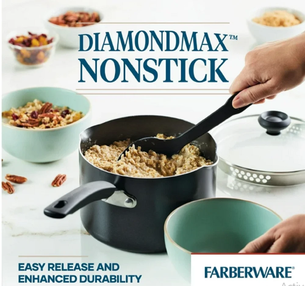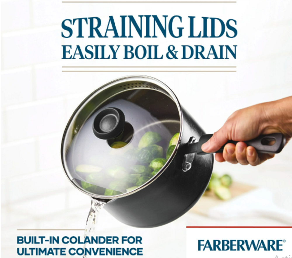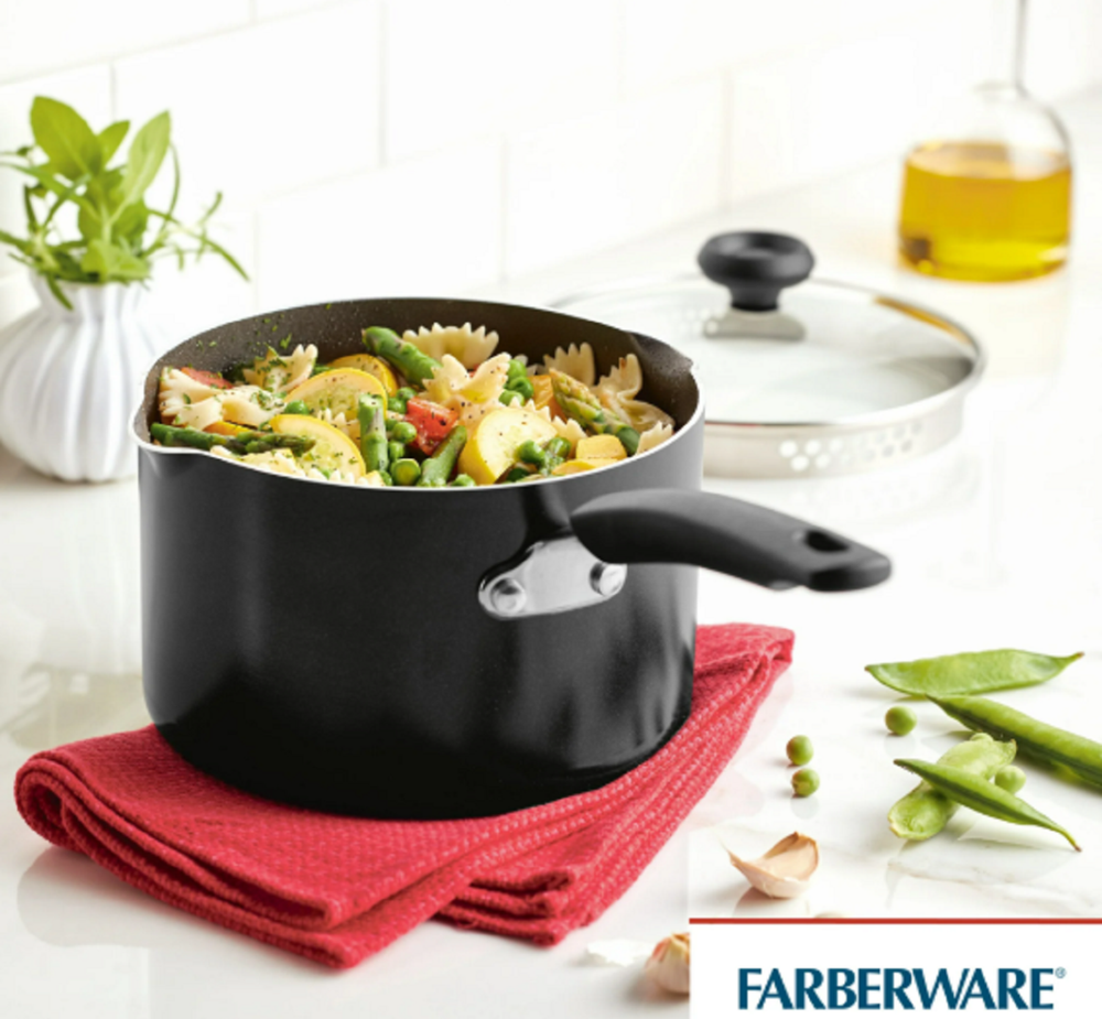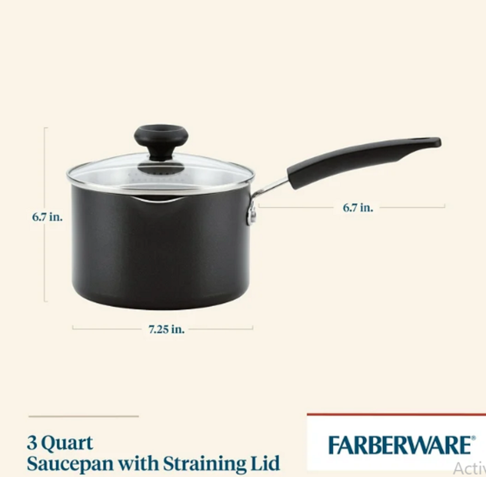 Farberware Easy Clean 3 Quart Nonstick Straining Sauce Pan with Pouring Spout and Lid, Dishwasher Safe, Black Description: Boil, braise, simmer and sear with the value, modern convenience and the quality performance home cooks have depended on since 1900 using the Farberware® Easy Clean 3-Quart Covered Straining Saucepan. This versatile, dishwasher-safe saucepan is perfect for everyday cooking of family favorite recipes like Cilantro Black Beans and Sausage or a one-pot feast of Moroccan Chicken and Rice with Chickpeas. The saucepan boasts high-quality DiamondMax™ nonstick for superior food release that performs 3X better than traditional ceramic nonsticks, and a black pan exterior adds a touch of style to any kitchen. Oven safe to 350°F, the saucepan is constructed from heavy-duty aluminum that heats quickly and evenly, reducing hot spots that can burn foods. A double-riveted handle helps cooks move around the kitchen with confidence, and a shatter-resistant glass lid seals in heat and moisture while also acting as a convenient strainer for pasta water or cooking juices. Best of all, Farberware® Easy Clean is dishwasher safe for the perfect combination of function and style. Please the family with favorite foods and ease the cooking and cleaning, with the dishwasher-safe convenience of the Farberware® Easy Clean 3-Quart Covered Straining Saucepan. BUILT TO LAST: Durable dishwasher-safe nonstick skillet makes everyday cooking easy and cleanup even easier FAST EVEN HEAT: The aluminum construction heats quickly and evenly, reducing hot spots that burn foods SMOOTH RELEASE: High-quality DiamondMax™ nonstick provides superior food release that performs 3X better than traditional ceramic nonsticks SOLID HANDLING: Sturdy, double riveted handle helps cooks move confidently from stove to oven to table PUT A LID ON IT: Glass lid incorporates a convenient strainer and allows the cooking process to be monitored while keeping heat and moisture sealed in STOVE TO OVEN: Oven safe to 350 degrees F for moving family recipes from stovetop to oven to table