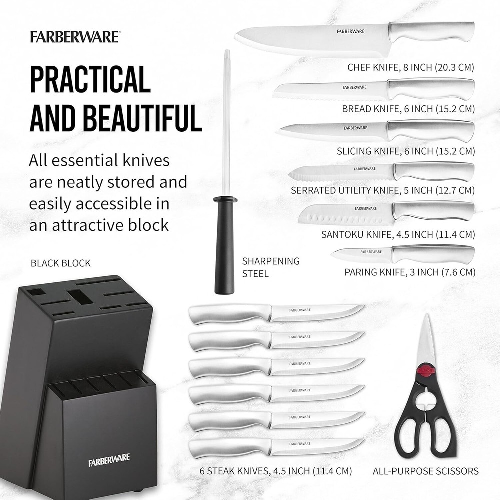 About this item HIGH QUALITY BLADE: Each blade is expertly crafted from superior quality, high carbon stainless steel which ensure the blades retain their ultra-sharp edge longer than conventional stainless steel and provide precision results COMFORT GRIP: Featuring a satin finish, the handles are crafted from stainless steel and are ergonomically designed for a comfortable grip; Each knife is perfectly balanced for precision while cutting PERFECT SET FOR BACK TO COLLEGE : Best gift for new college students, grads, newlyweds, or anyone setting up a first time kitchen; A great set for those who know their way around a kitchen as it is or for newbie chefs just learning the ropes. 15-PIECE SET INCLUDES: 8-inch chef knife, 8-inch bread knife, 8-inch slicer, 7-inch Santoku, 5-1/2-inch serrated utility knife, 3-1/2-inch Paring knife, scissors, a sharpening steel and six 4-1/2-inch long steak knives EASY CARE: Farberware knives should be hand-washed with warm water and a mild detergent. Rinse and dry immediately. Stainless steel knives are not dishwasher safe. Lifetime limited warranty. Farberware is the #1 selling cutlery brand in the U.S. (Source: The NPD Group, Inc./Retail Tracking Service. 52 weeks ending March 2016) This 15-piece set includes an 8-inch chef knife, 8-inch bread knife, 8-inch slicer, 7-inch Santoku, 5-1/2-inch serrated utility knife, 3-1/2-inch paring knife, a pair of shears, a sharpening steel and six 4-1/2-inch long steak knives. All knives feature high-carbon stainless steel blades which ensure the blades retain their ultra-sharp edge longer than conventional stainless steel Each knife features an ergonomic brushed steel handle for greater durability. Not dishwasher safe. Hand wash with warm water and a mild detergent; rinse and dry immediately.