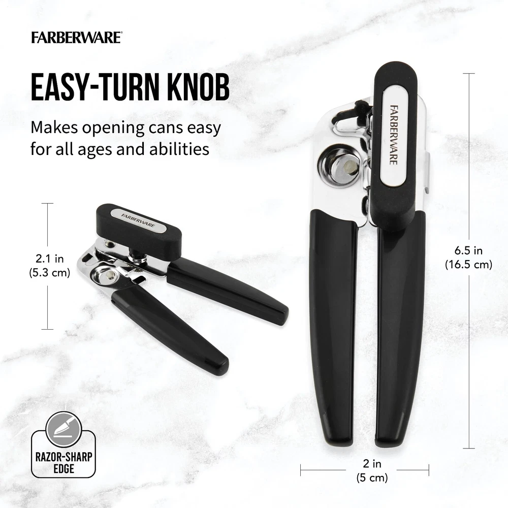 The Farberware Professional Portable Can Opener in Black features a razor-sharp, stainless steel cutting wheel that easily slices through the tops of cans of all sizes. The easy-turn knob makes opening cans effortless. This durable tool is made from food-safe, BPA-free materials that stand up to daily use. The compact design allows for easy storage in cabinets and drawers. Lifetime Limited Warranty. ESSENTIAL TOOL: razor-sharp, stainless steel cutting wheel easily slices through the tops of cans of all sizes EASY-TURN KNOB: makes opening cans effortless DURABLE: made from food-safe, BPA-free materials that stand up to daily use COMPACT: allows for easy storage in cabinets and drawers QUALITY ASSURED: one-year hassle-free replacement, plus Lifetime Limited Warranty Founded over 100 years ago, Farberware has always stood for value, quality and durability. It's no wonder that they are the best-selling cutlery brand in America today. From knives and cutting boards to pantryware and gadgets, each item in the Farberware family of products is designed with you in mind and is built to the highest standards. Farberware offers a complete line of tools and gadgets, from classic to contemporary, for all of your food preparation tasks. With everything from a set of measuring spoons for precise cooking to an odor-absorbing splatter screen that protects you from splatters and cooking aromas, Farberware tools and gadgets are designed to make cooking enjoyable and efficient.