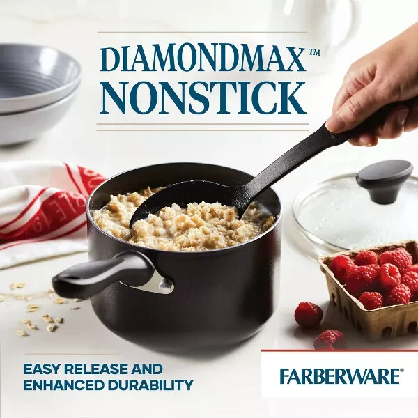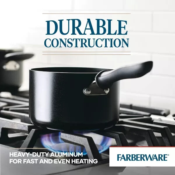 Everyday home cooks can count on the quality performance and easy cleaning of the Farberware Reliance Aluminum Nonstick 2-Quart Saucepan with Lid. The large saucepan features sturdy aluminum construction for efficient cooktop performance and fast, even heating throughout the pan base and sides. The pan interior is finished in durable nonstick that makes cleanup simple and helps promote healthier cooking, with less fats and oils required. The saucepan’s colorful exterior is easy to clean and adds a pop of kitchen style. Dishwasher safe for quick cleanup. Oven safe to 350°F. QUALITY COOKWARE: Saucepan features sturdy aluminum construction for fast, even heat and reliable cooking performance PREMIUM NONSTICK: Long-lasting nonstick saucepan provides effortless food release for healthier cooking with easy cleanup USE LOW TO MEDIUM HEAT: Our nonstick skillets perform their best and last the longest when used on low to medium heat with matching burner sizes LOCK IT IN: The saucepan's tempered glass lid seals in heat and flavor for rich sauces and reductions QUICK TO CLEAN: Saucepan and lid are dishwasher safe for easy cleaning STOVE TO OVEN: Nonstick saucepan is oven safe to 350°F