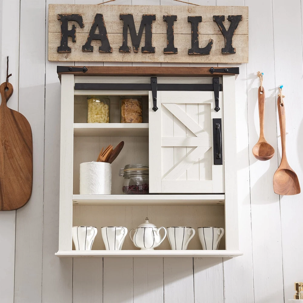 [BATHROOM ORGANIZER] 23.5"L × 7.8"W × 24"H, This elegant wall-mounted storage cabinet is a versatile and practical way to save precious floor space in your lovely bathroom, generating a space for small toiletries and bathroom clutter [FARMHOUSE RUSTIC STYLE] Made of a blend of sturdy engineered wood with weathered natural wood grain for an abundance of classic farmhouse aesthetic. The sliding barn door with smooth railing tracks could not only ensure the simple pulling conveniently, but also as an eye-catching focal point in your home [CUSTOMIZED STORAGE SPACE] The interior is featured 3-position adjustable shelf that moves up and down, or out for a storage space customized to all your needs, it offers enough large storage space to place items of different sizes so you could install it in kitchen, etc. not just bathroom [WATERPROOF MATERIAL] Waterproof surface and anti-rust coated metal accent hinges are ready to be used in moisture environments and easy to clean dust off, which makes it really suitable for using in bathroom and guarantees a long-term use even around some humidity [EASY ASSEMBLY] Our product accepts a scientific structure design and is easy to assemble. Step-by-step assembly instructions and hardware pack are included in one package. Also, all parts are labeled with own numbers for recognition. If you have any problem, please feel free to contact us