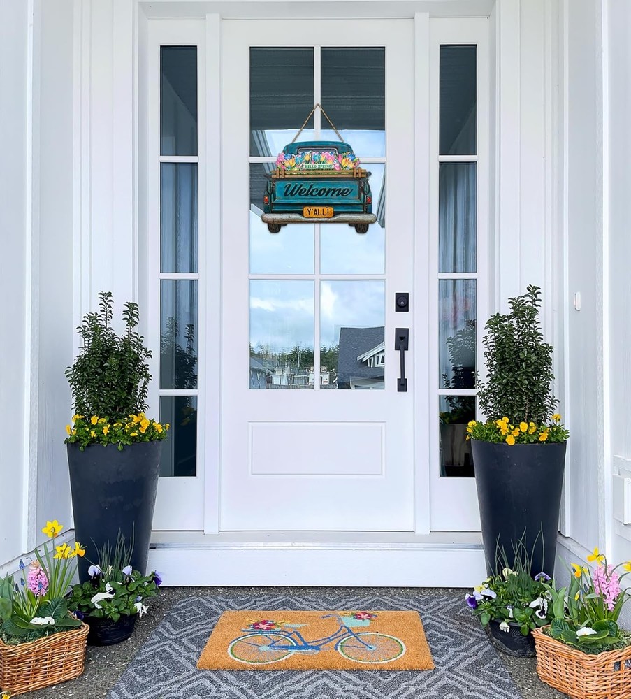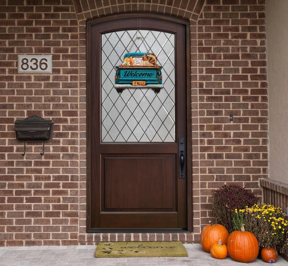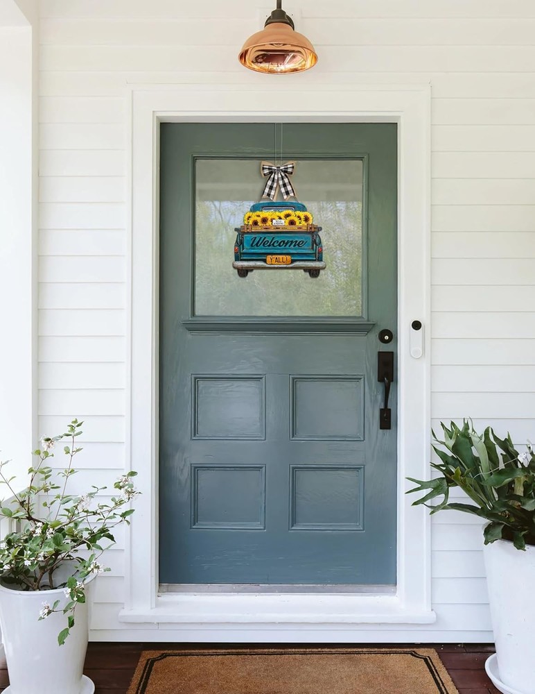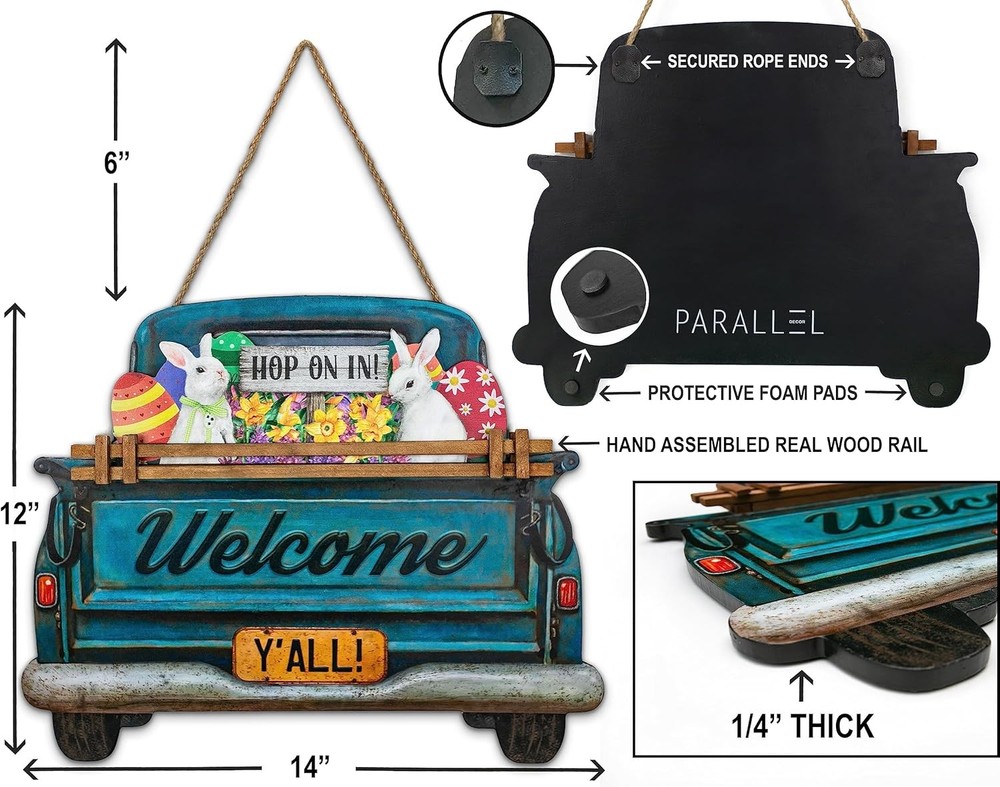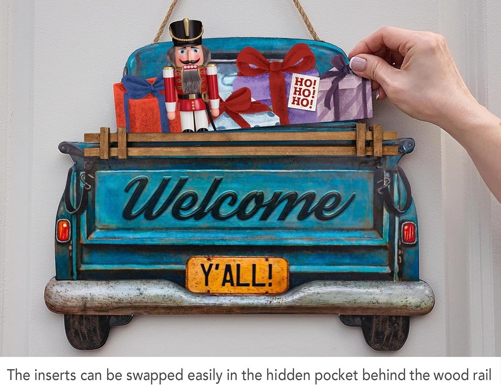Interchangeable Welcome Sign for Front Door Blue Farmhouse Truck Decor Multi Product Details Product Dimensions: 15"L x 12"W Shape: Rectangular Style: Blue Farmhouse Truck Pre-printed: Welcome Item Thickness: 0.25 Inches Included Components: Interchangeable Seasonal and Holiday Decor Signs Item Weight: 2.81 pounds Manufacturer: Parallel Decor Country of Origin: China Item model number: 0 Color: Multi Brand: Parallel Decor Material: Engineered Wood Theme: farmhouse Mounting Type: Door Mount CHANGE YOUR FRONT DOOR DECOR ALL YEAR ROUND Our interchangeable home sign for your front door or porch comes with 11 unique interchangeable seasonal and holiday signs for Spring, Summer, Fall, Winter, Christmas, Thanksgiving, Easter, 4th of July, Halloween, Valentine’s & St Patrick’s day. Our seasonal welcome signs are not only beautiful to look at but are also versatile and easy to use. Change your front door decor instantly by swapping the seasonal decor sign on the truck. The truck has a hidden pocket slot behind the wood guard rail to hold it firmly in place. MATERIALS AND SIZE Suitable for most front doors, our interchangeable door sign measures 14” wide & 12” high (18” including the rope height) The design is UV printed in high resolution on a sturdy 1/4” thick MDF board so it's waterproof and will not warp or fade easily. The sturdy jute rope gives it a rustic farmhouse feel. The back side is finished with a clean black coating and foam pads to protect it from scraping your door. ARRIVES READY TO HANG Our welcome sign arrives at your door ready to be hung. Simply choose the appropriate design for the season, slip it into the slot behind the wood rail and it’s ready to hang on your door. A PERFECT GIFT FOR LOVERS OF FARMHOUSE DECOR Our seasonal welcome sign decoration is an ideal gift to give or receive for any occasion including Christmas, Housewarmings, Birthdays and Mother’s day.